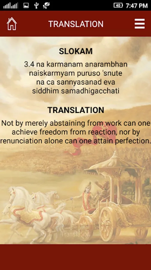 The epic Mahabharata is traditionally ascribed to the Sage Ved Vyasa; the Bhagavad Gita, being a part of the Mahabharata, is also ascribed to him.Theories on the date of composition of the Gita vary considerably.Bhagavad Gita is one of the most popular and important religious classics of the world. This application contain slokas and meaning full translation of the slokas.