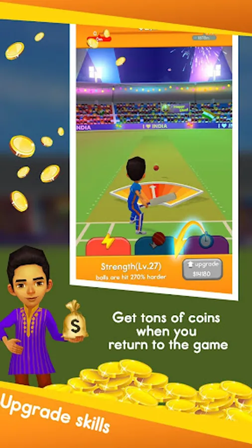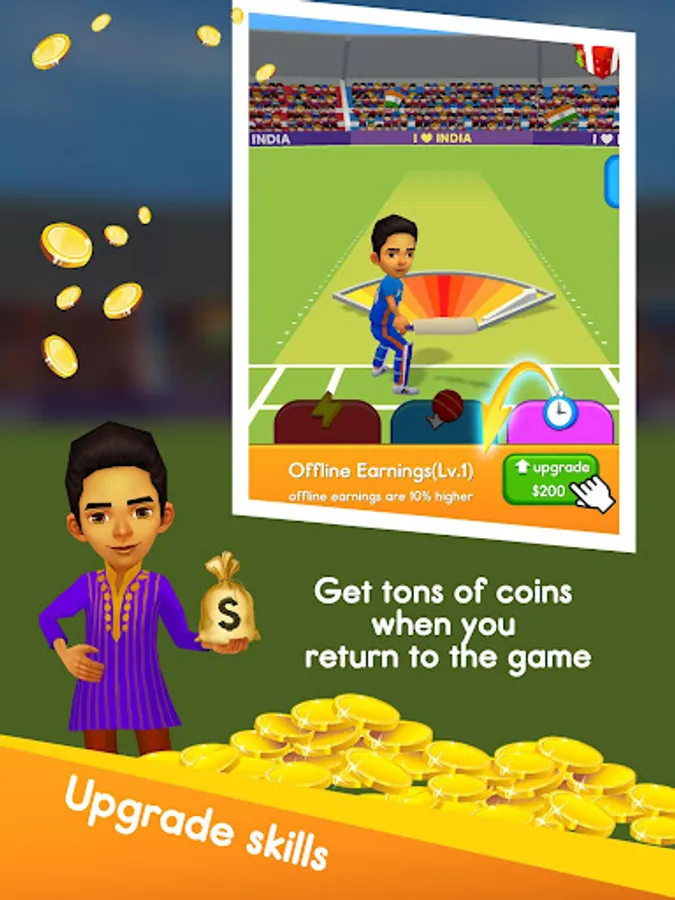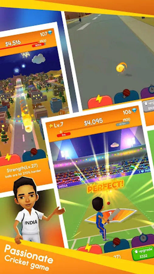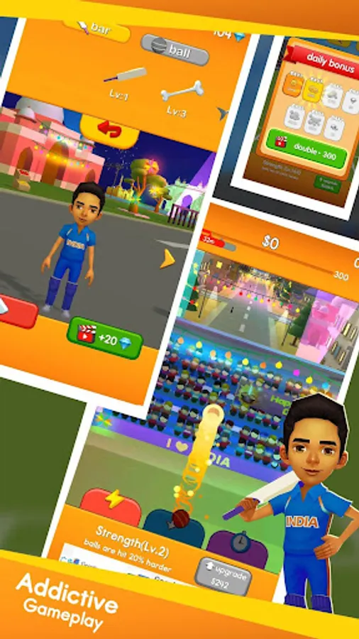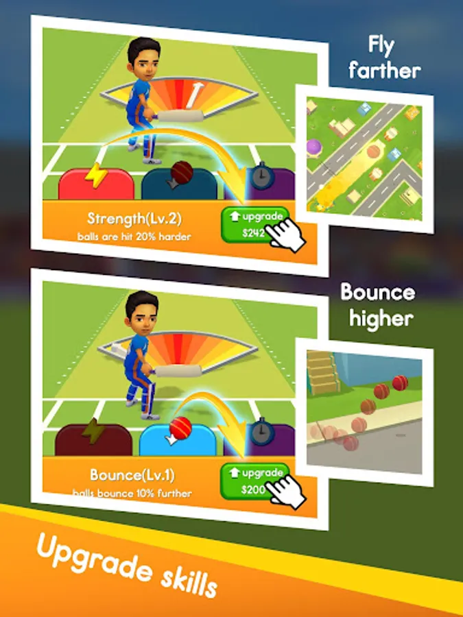 You need to find the best timing and hit your cricket ball as far as possible. The farther you can hit, the more coins and diamonds you can get. Don’t forget to upgrade your skills and unlock interesting items! Now, find the perfect angle and make a great strike!