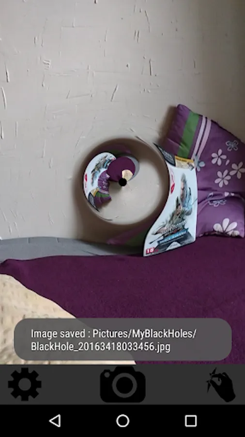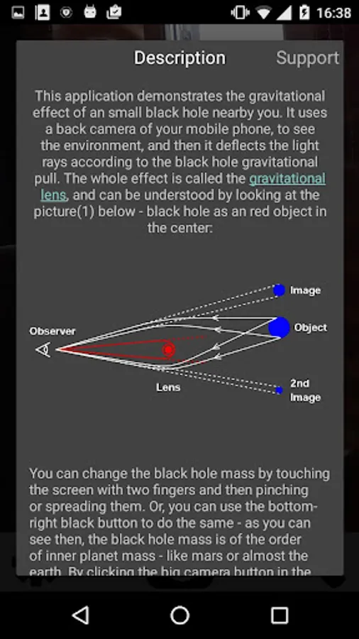 Uses the camera of your phone to simulate the Black hole being 1m (3.28ft) away from you. Black hole mass here is similar to the mass of the planets like Mars or Earth. You can change the mass with the pinch gesture or slider. Allows you also to save the full-resolution photo of the Black Hole. Uses the real field of view angles from your phone's camera.