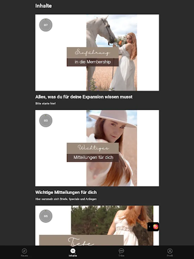 Die App bietet dir deine komplette Wild Horse Tribe Membership zum Mitnehmen und macht das Wissen für dich an jedem Ort verfügbar, denn diese Membership soll dich nicht nur weiterbilden. Sie soll dich begleiten und an deiner Seite sein - auf deinem achtsamen Weg mit deinem Pferd.