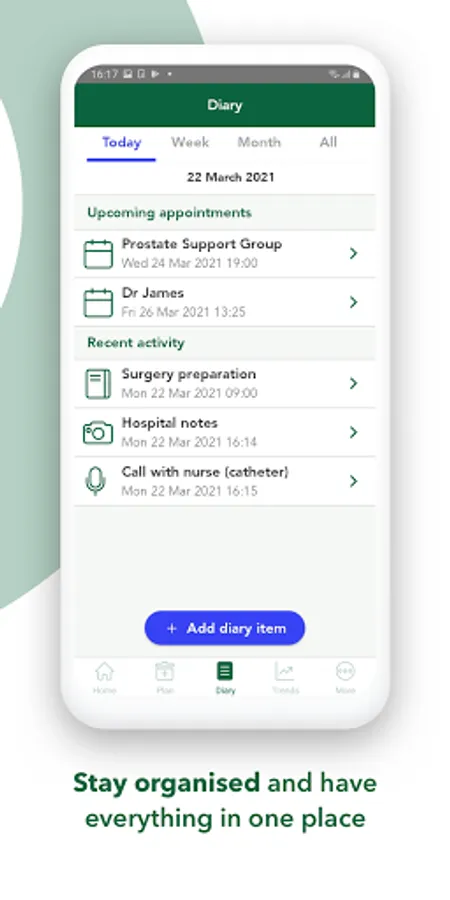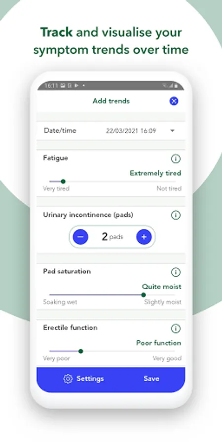 ● Track your prostate cancer symptoms and side-effects to understand your wellbeing progress.