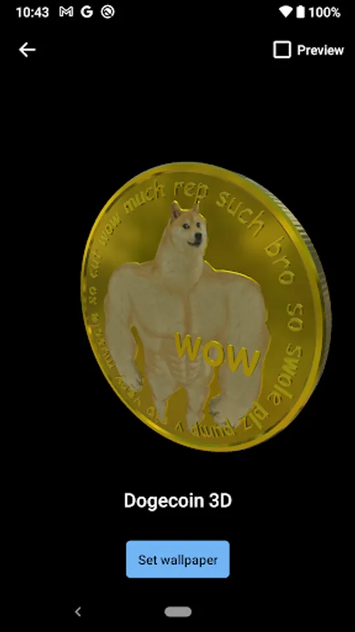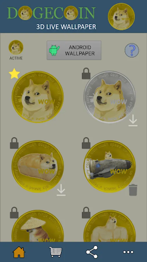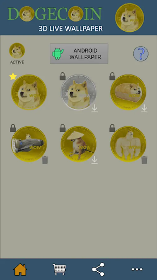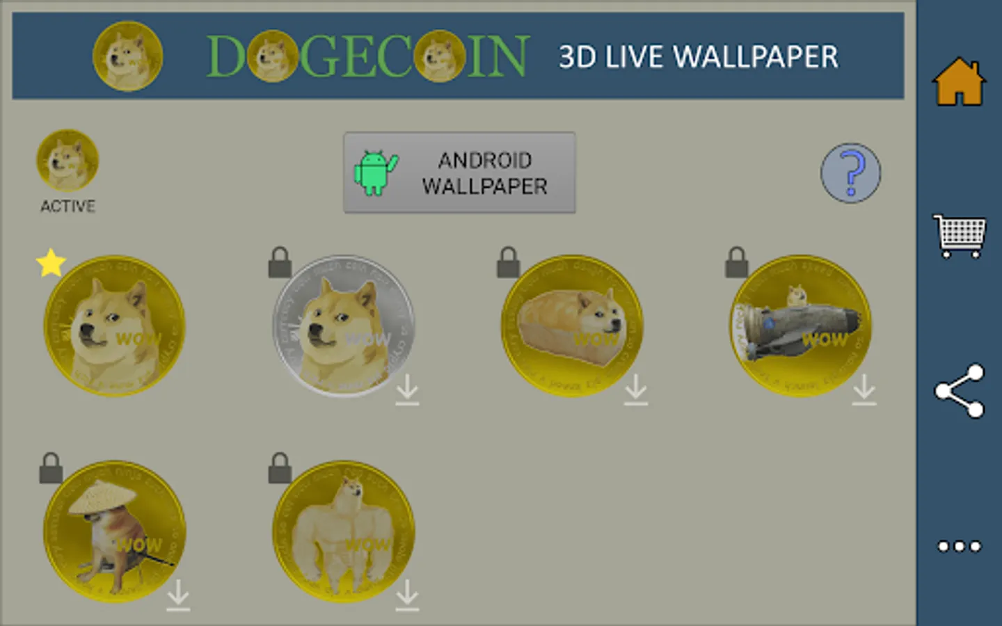 The standard "gold" Dogecoin is included with the initial download and automatically available as the default live wallpaper. Each additional themed 3D model wallpaper requires a separate download and is free to preview, with each corresponding live wallpaper unlocked via a short rewarded video ad.