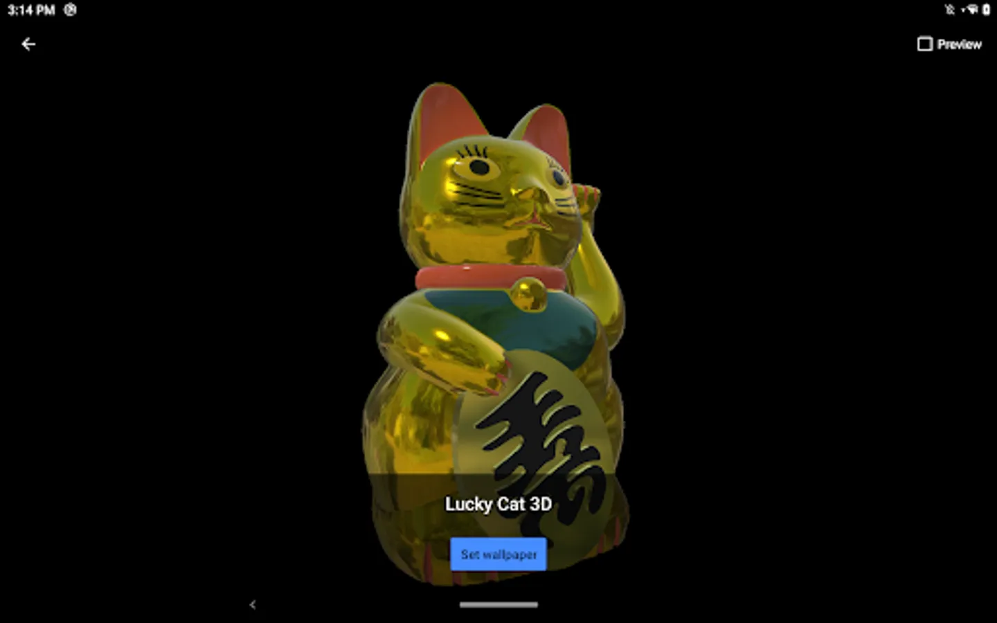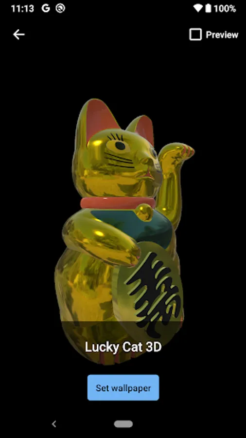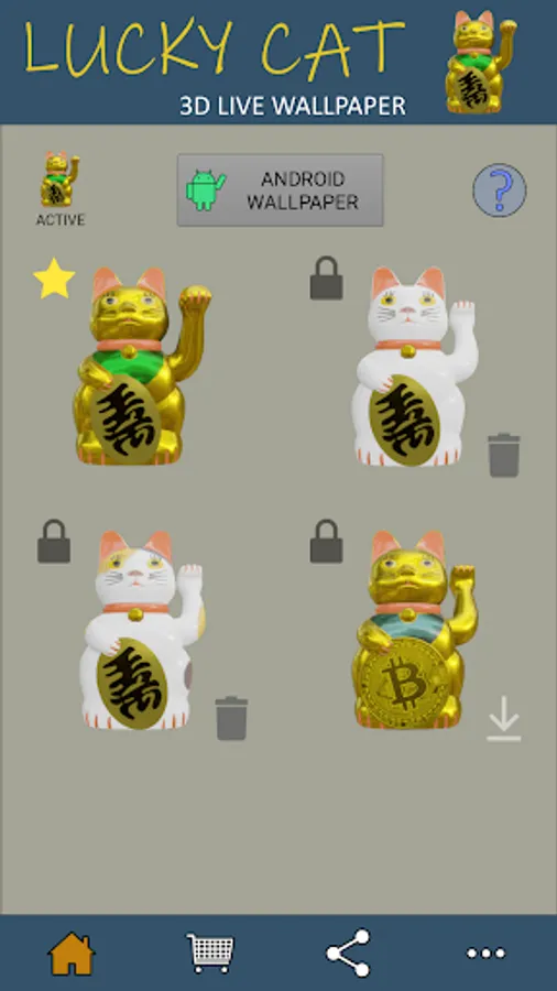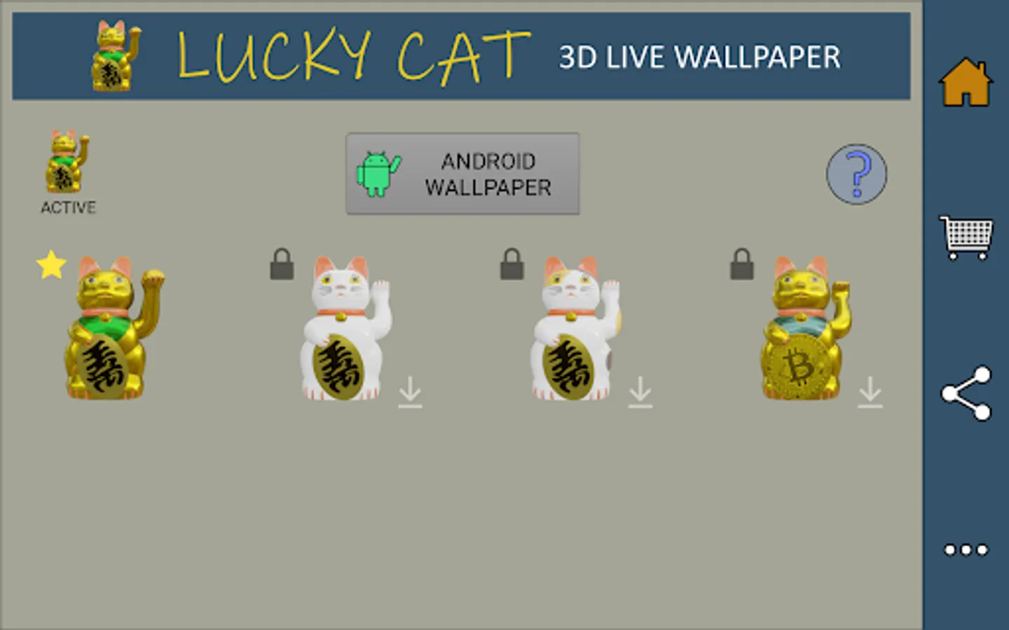 The standard "gold" Lucky Cat is included with the initial download and automatically available as the default live wallpaper. Each additional themed 3D model wallpaper requires a separate download and is free to preview, with each corresponding live wallpaper unlocked via a short rewarded video ad.