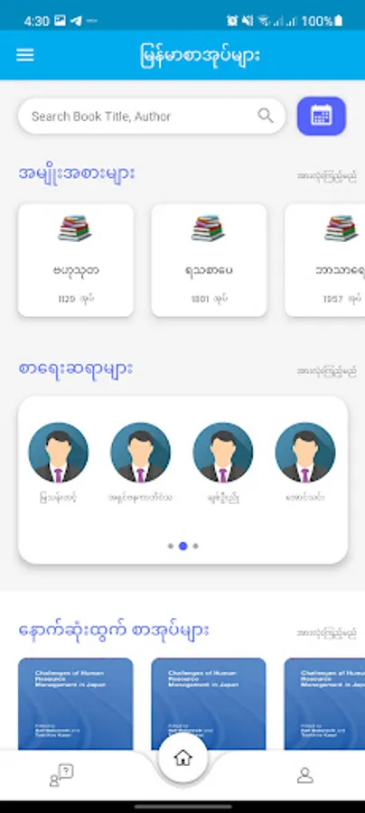 စာအုပ်ရှာဖွေရာတွင် လွယ်ကူစေရန်အတွက် စာအုပ်အမျိုးအစားခွဲခြားခြင်း (ဥပမာ-မြန်မာ စာအုပ်၊ အင်္ဂလိပ်စာအုပ်) ဝန်ကြီးဌာနထုတ်စာအုပ်၊ အဖွဲ့အစည်းထုတ်စာအုပ်များ၊ ပညာရပ်များ ခွဲခြားခြင်း (ဥပမာ-နိုင်ငံရေး၊ ဘာသာရေး၊ ပညာရေး၊ စီးပွားရေး၊ သမိုင်း၊ အုပ်ချုပ်မှု၊ ယဉ်ကျေးမှု၊ အတ္ထုပ္ပတ္တိ---) စသည်ဖြင့် စီစဉ်ထားပြီး စာရေးသူအမည်ဖြင့်လည်း ရှာဖွေနိုင်အောင် စီစဉ်ဆောင်ရွက် ထားပါသည်။ ထို့အပြင် Calendar Box ကိုနှိပ်၍ စာအုပ်ထုတ်ဝေသည့် နေ့စွဲကို ရွေးချယ်၍လည်း ရှာဖွေနိုင်ပါသည်။