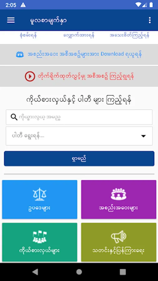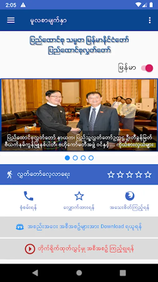 Mobile Application တြင္ အစည္းအေဝးမ်ား၊ ကိုယ္စားလွယ္မ်ား၊ ျပည္ေထာင္စုလႊတ္ေတာ္၏ အေၾကာင္းအရာမ်ား၊ ဥပေဒမ်ားႏွင့္ သတင္း မ်ားအား ျပည့္စုံစြာတင္ျပထားပါသည္။