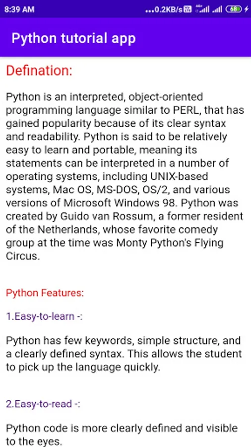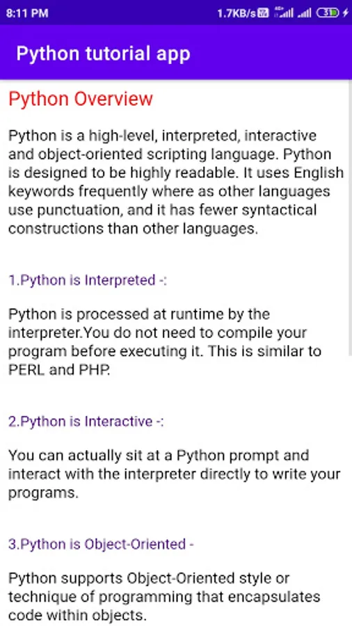 in this app included a python tutorial provides. python is teaching a basic concept of step-by-step teaching.