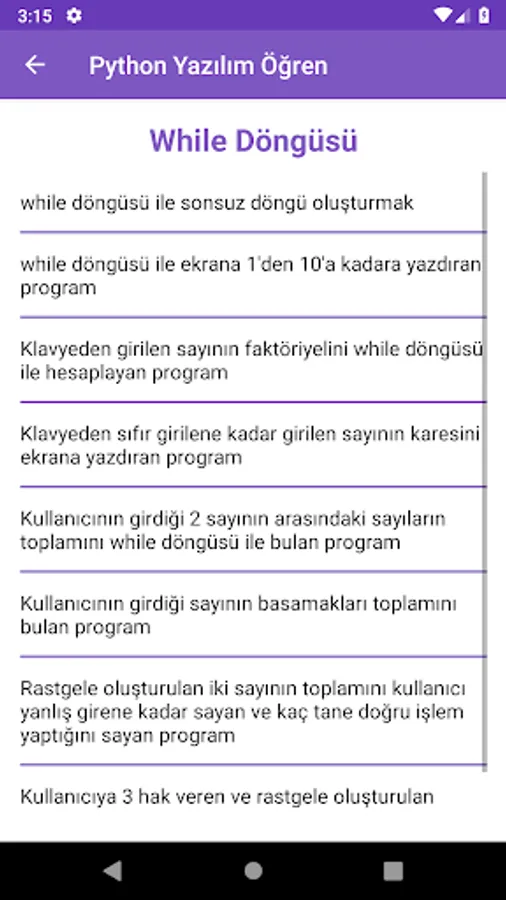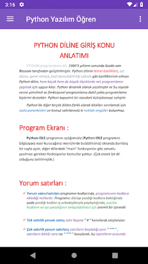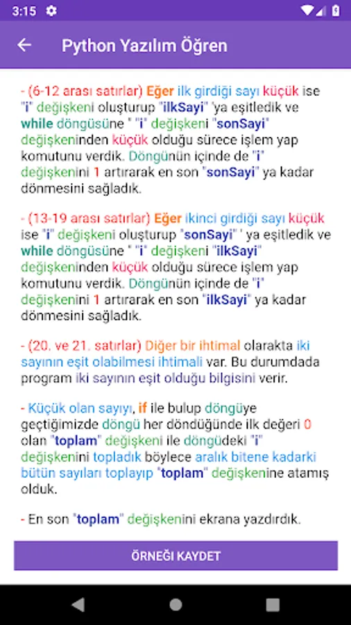 In our application there are 98 colored sample codes (programs). Each example has a "screen output" and a "colorful, clear note" explaining each code line by line. Colored codes and description will increase your learning disposition and success.