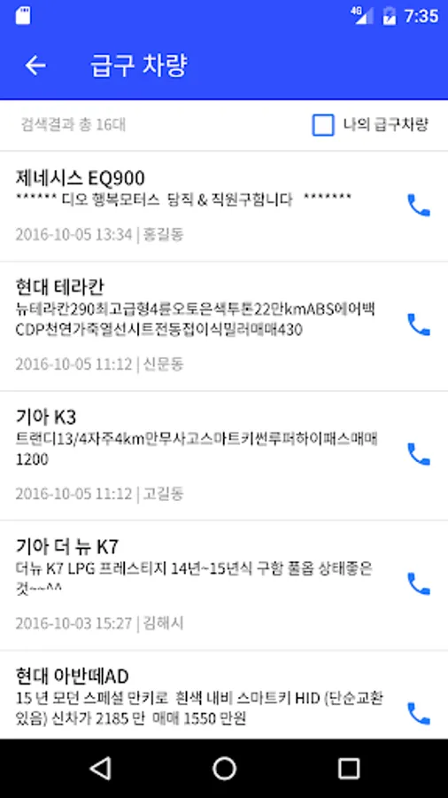 - 급구차량 : 긴급 구입 차량을 게시하고 당사자와 전화연결 가능