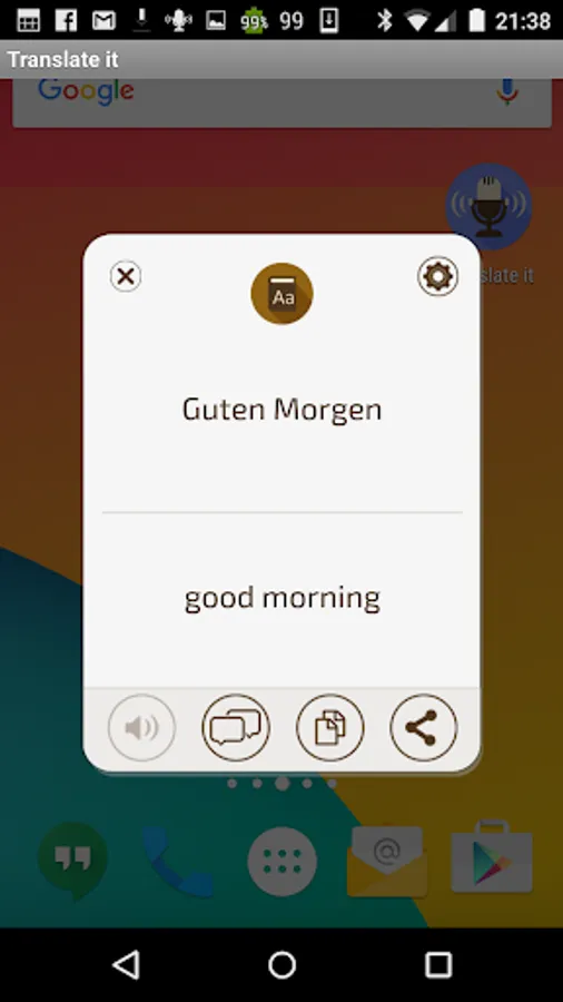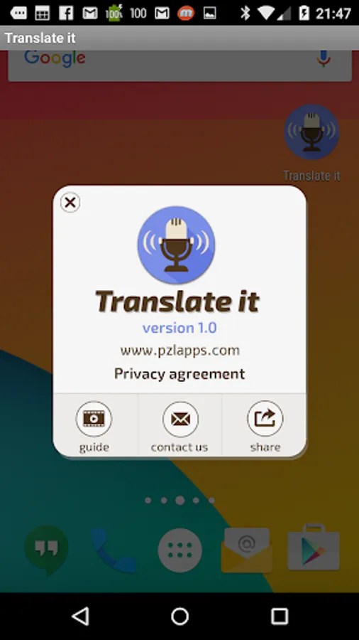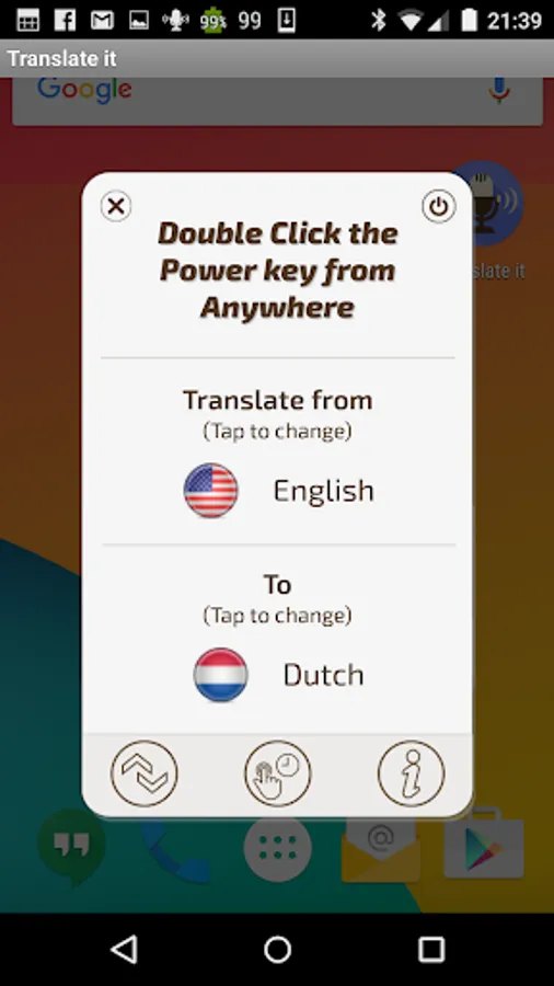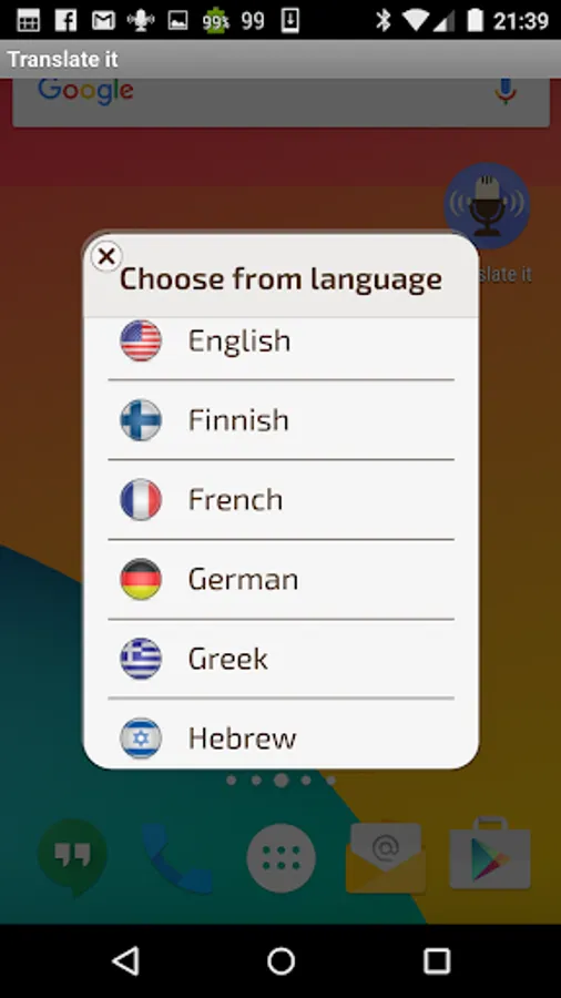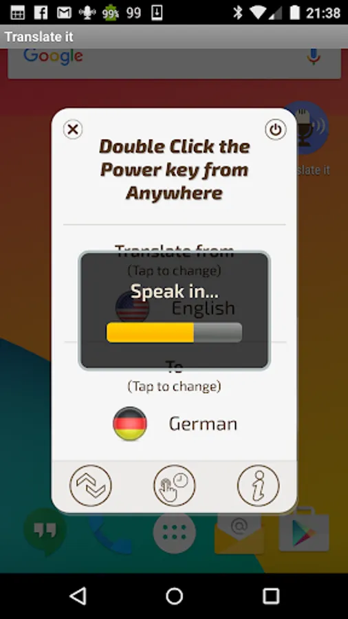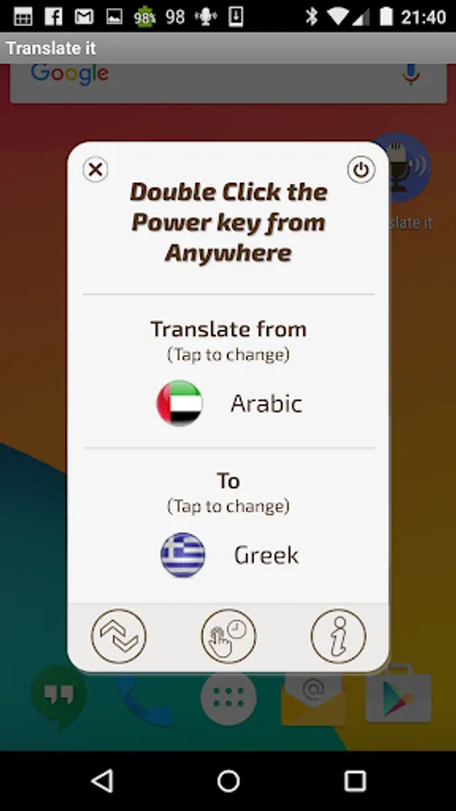 Translate it Voice translator allows you to instantly speak and translate by clicking the quick launch item which is floating on top of everything else. This is the fastest and easiest way to voice translate Translate it allows you to choose from any 29 supported languages. It’s the pocket voice translator you have been waiting for. It doesn't matter if you travel or just want to learn a language, voice translations have never been easier and quicker. You don’t have to enter the app just click and speak! within seconds you will see and hear the translations.