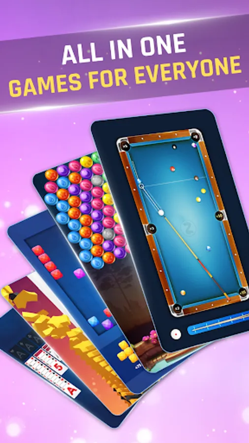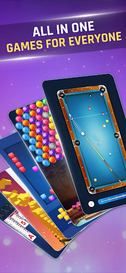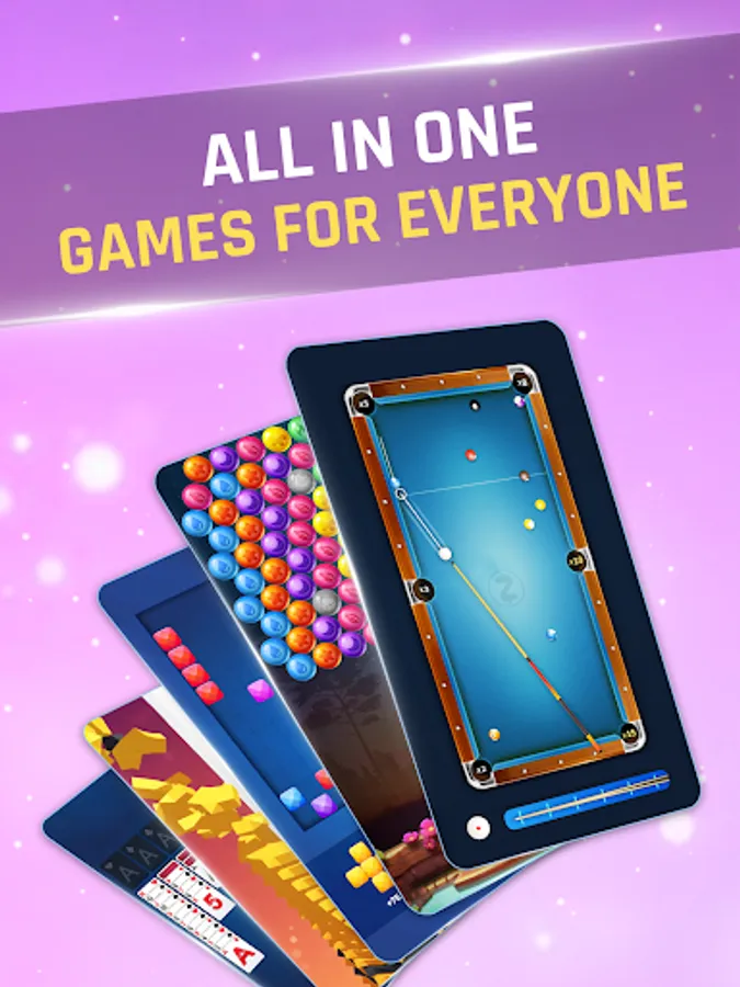 - Many casual games under one app. Bubble shooter, 21 Card, 8 ball pool, Solitaire, and many more