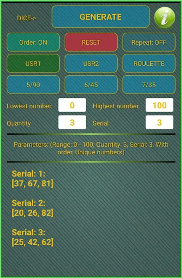 ★ Six predefined generator possibility (2 user defined, roulette number, and lottery numbers)