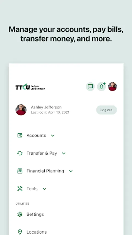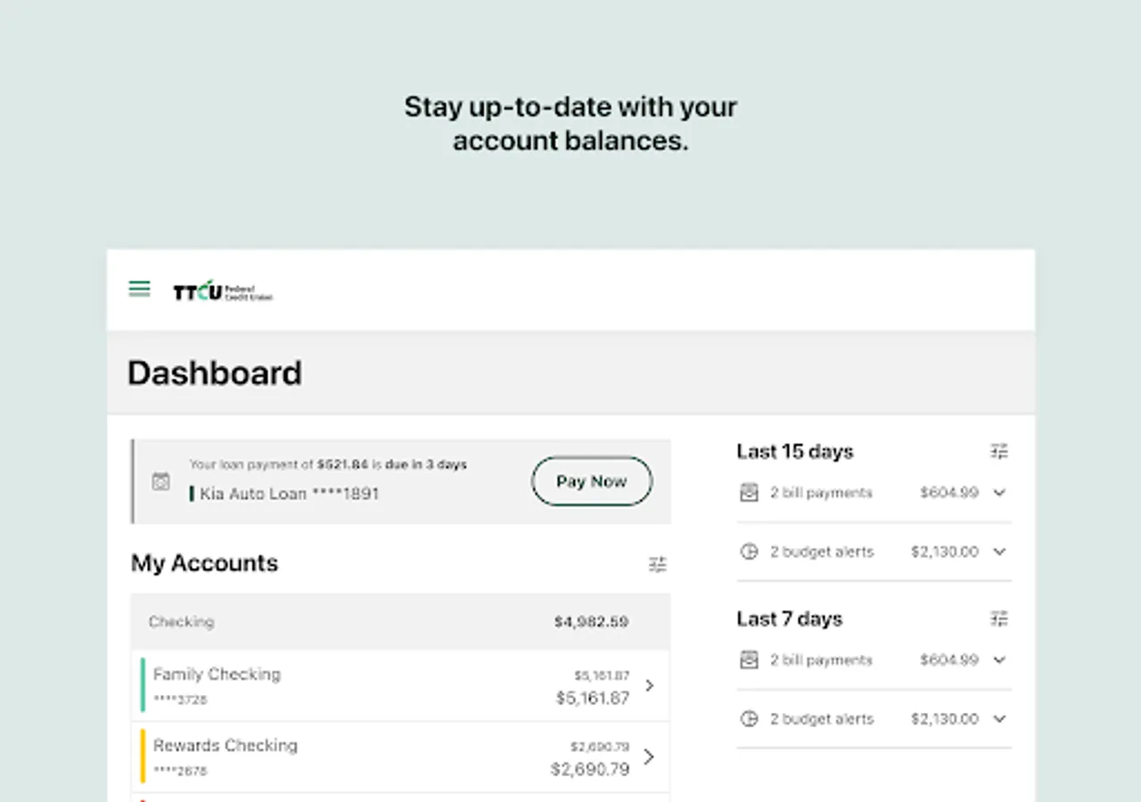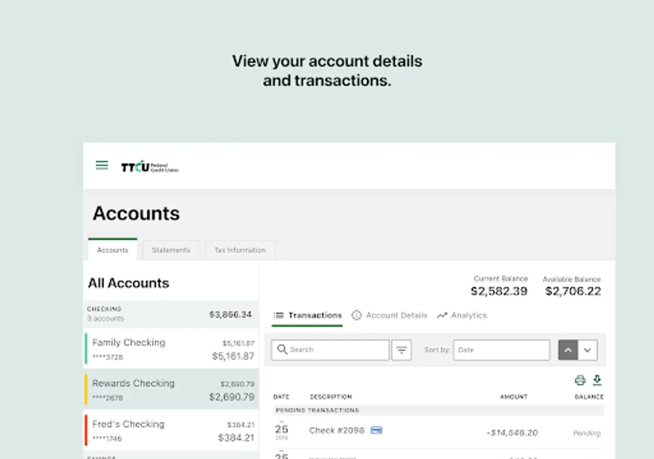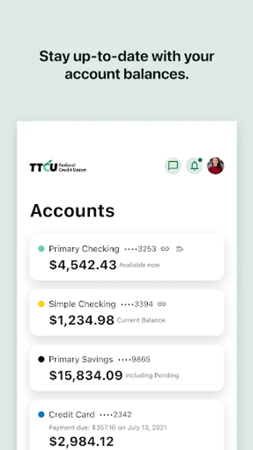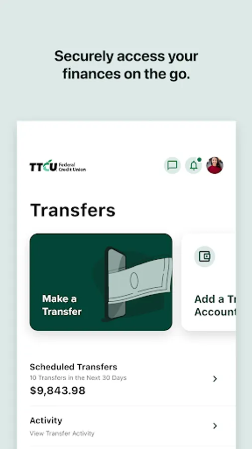 Control your finances from the palm of your hand with TTCU Mobile Banking. Download our latest mobile app today and securely manage your accounts on the go 24/7. Conveniently access your accounts, transfer money, deposit checks, monitor your credit score, track spending - all within TTCU's free mobile app.*