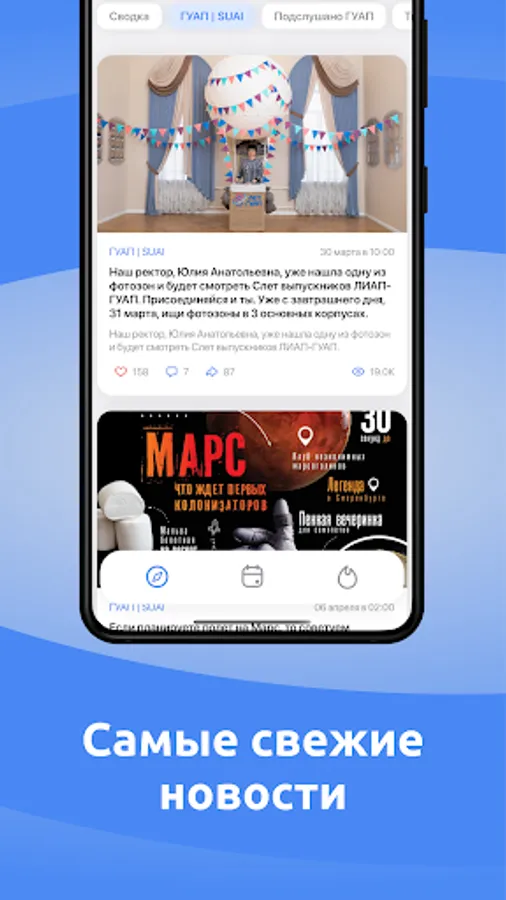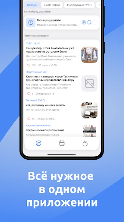 With it, you can keep track of your personal schedule, keep abreast of the latest news of the university and its sections, set tasks for yourself and complete them on time, receive assignments from teachers and much, much more coming soon!