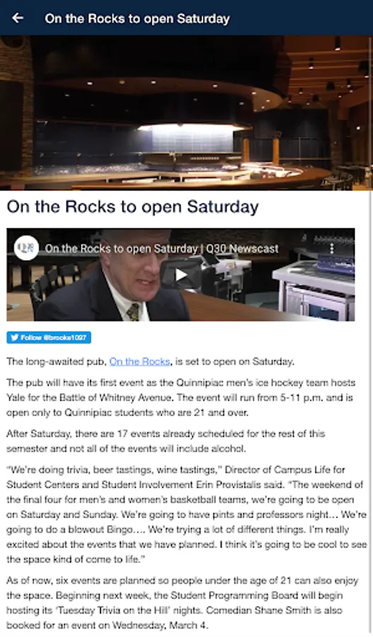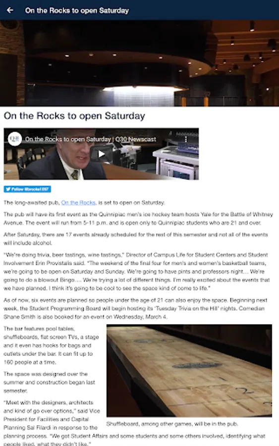 News – Read news stories pertaining to the Quinnipiac and local community, stay up to date on the Q30 Newscast, and view our twitter feed all in within the app.