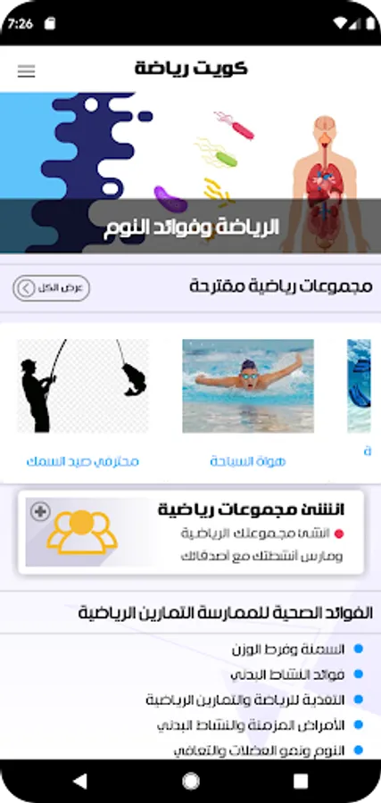 Kuwait Sports ... a sophisticated electronic application that works by encouraging and facilitating the practice of types of sports to facilitate access to a healthy lifestyle that contributes to reducing the possibility of contracting many physical and psychological diseases, especially chronic non-communicable diseases, which have become more prevalent in Kuwaiti society, such as vascular diseases Cancer, chronic respiratory diseases, stress and diabetes, in addition to psychological problems... which saves the Ministry of Health a lot of effort and money. Since the use of communication, information and multimedia technologies is the most important means of reaching all citizens of all ages and intellectuals, and within its societal mission, the Kuwait Association for Health Promotion and Health Media has developed this platform, "Kuwait Sports".
