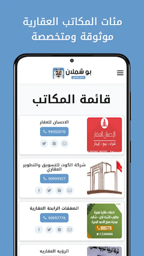- صفحة خاصة للمكاتب يمكن التعرف والتواصل فيها على الوسطاء والمكاتب العقارية المختلفة