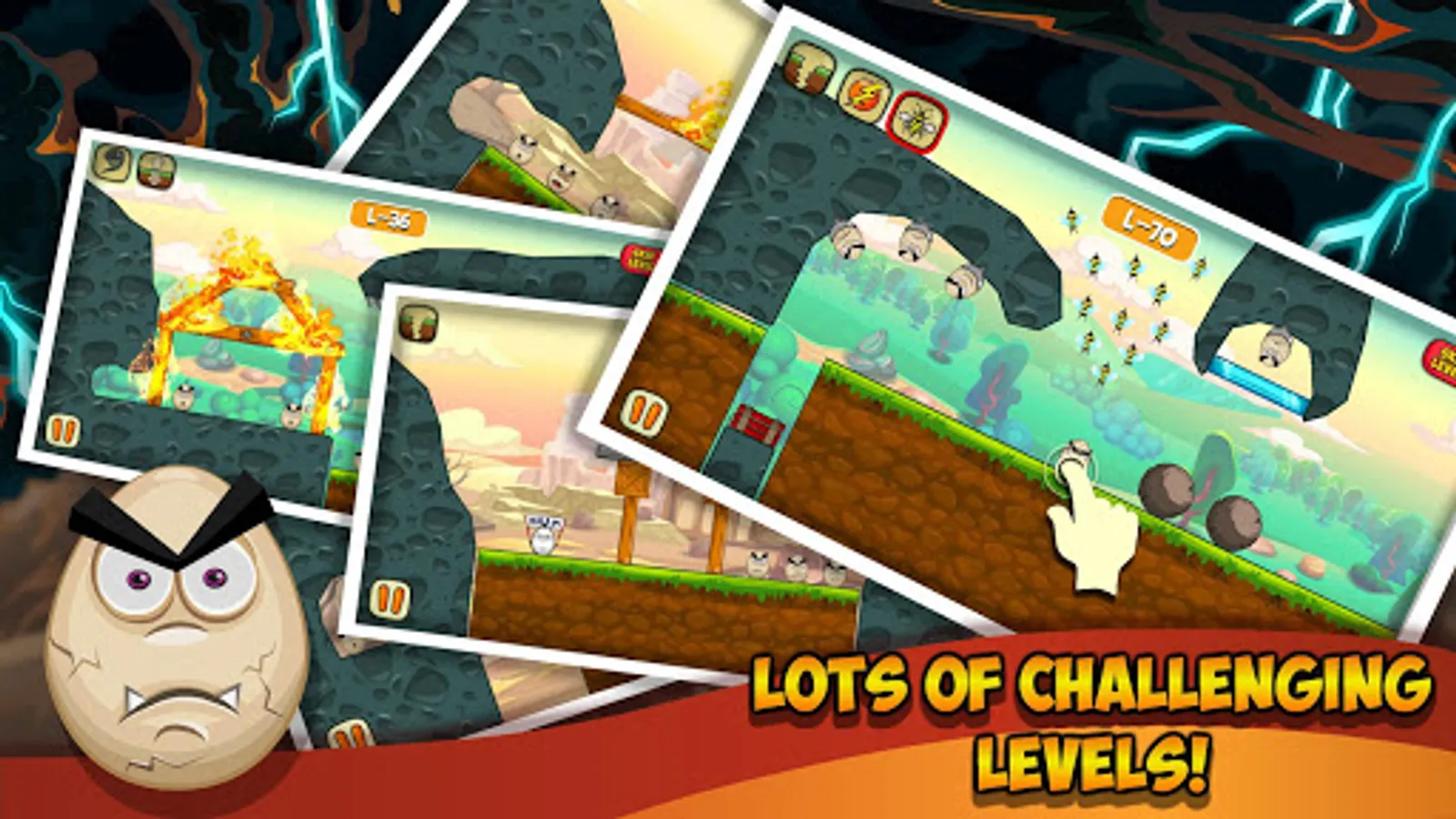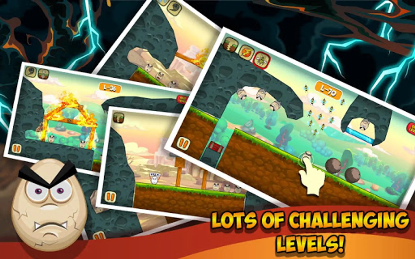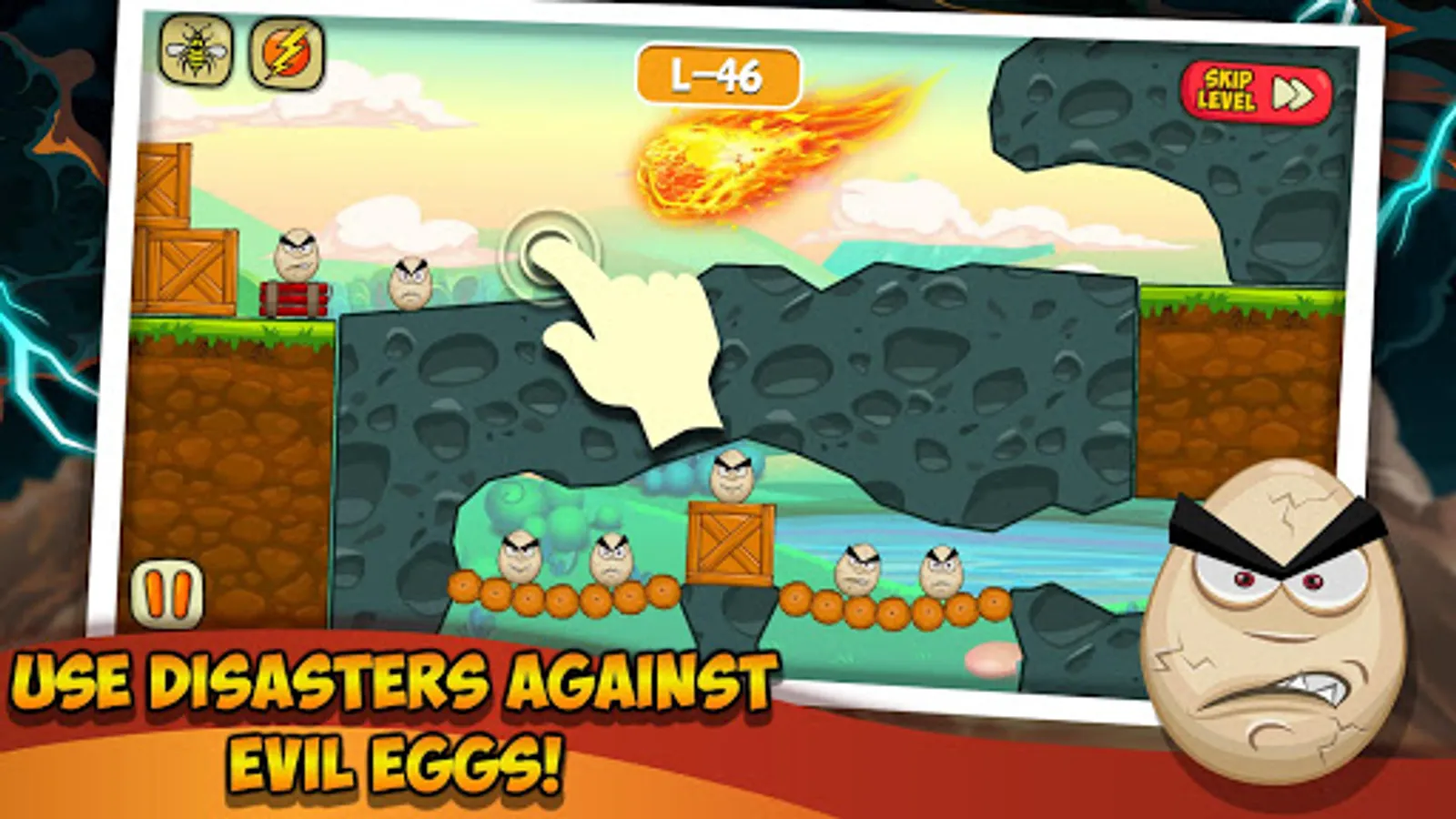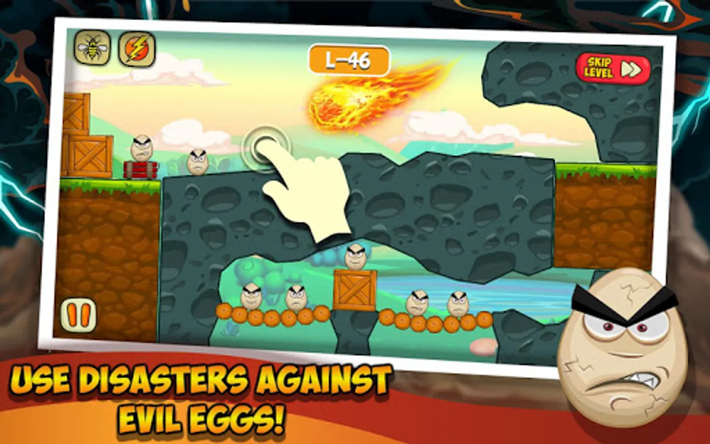 The game is an addictive puzzle game on Android, where your task is to destroy the evil eggs on each level. In this game, you can get help from various disasters, natural disasters and other objects that will help destroy the eggs.