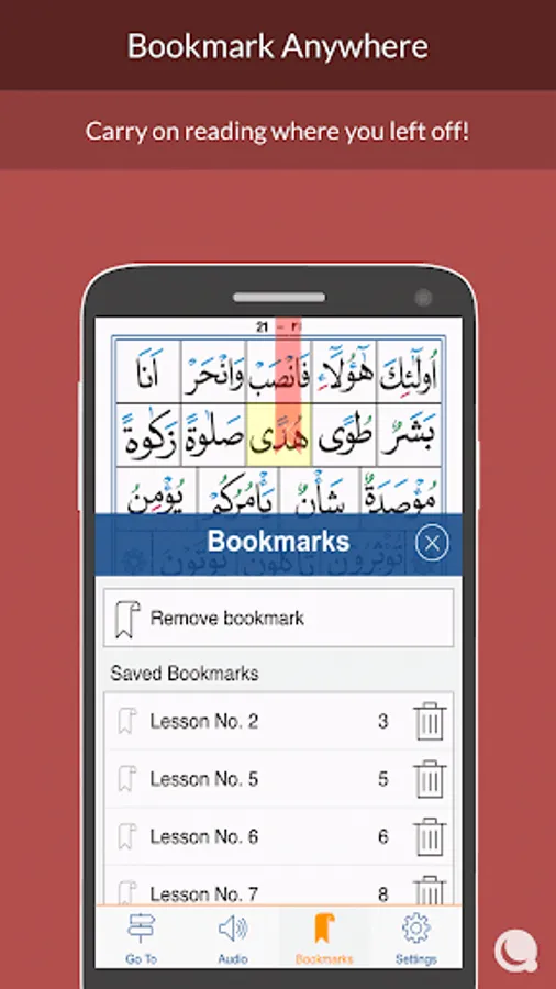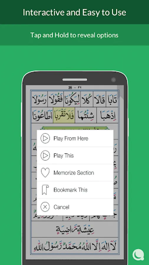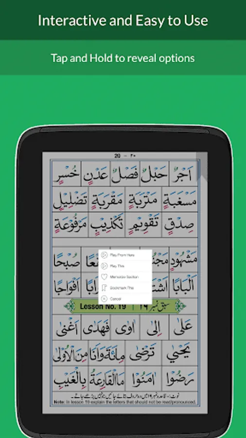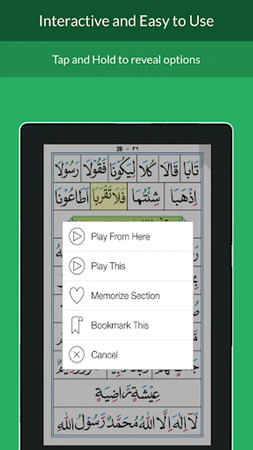 Simply tap and hold on any sentence to play the recitation,repeat and practice, and bookmark.