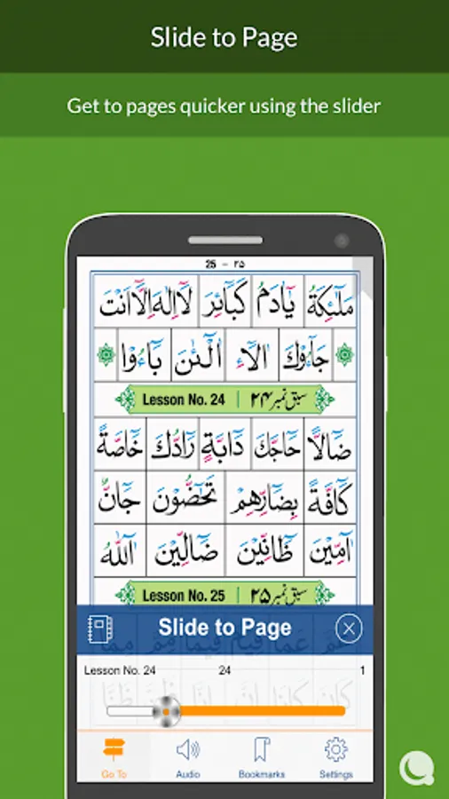 This app follows the progressive/step-by-step format starting from recognition of alphabets to reading complete sentences from the Quran using the correct pronunciation(tajweed) rules of reciting in Arabic style.