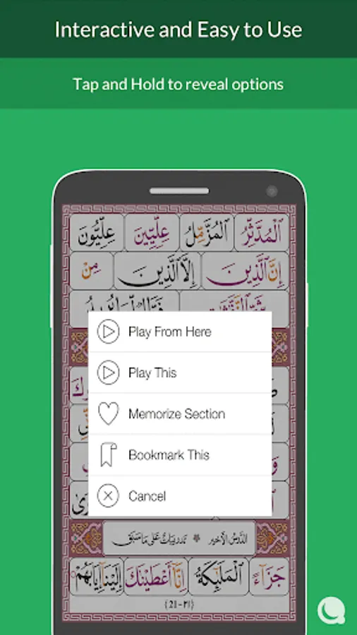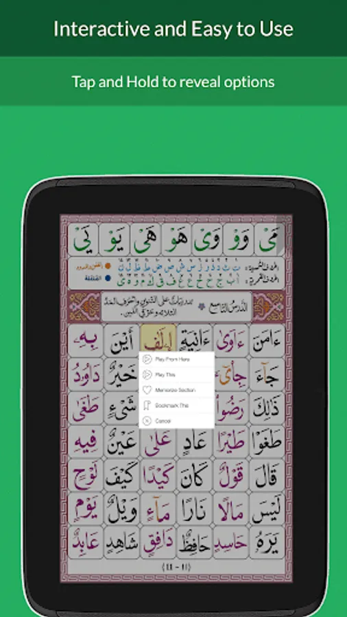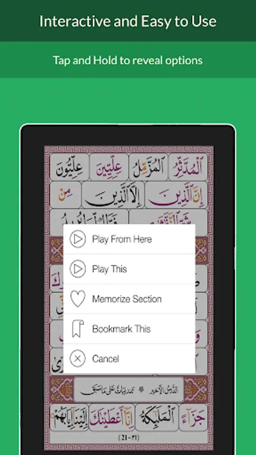 Simply tap and hold on any sentence or word to play the recitation, practice, and bookmark it.