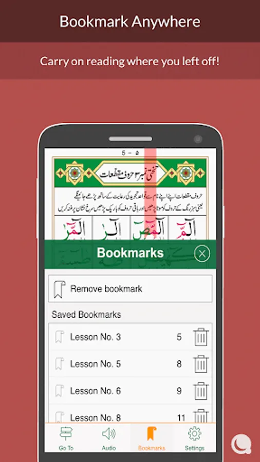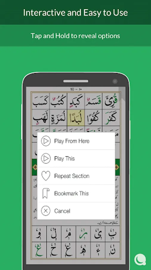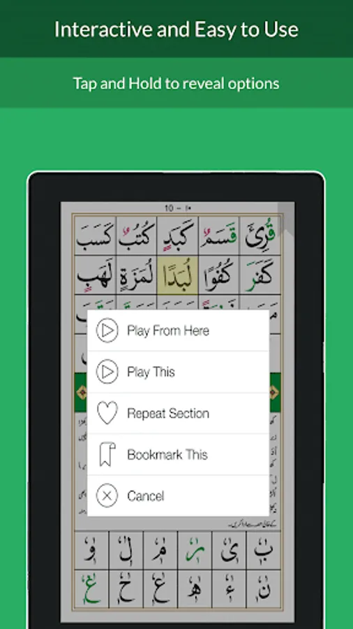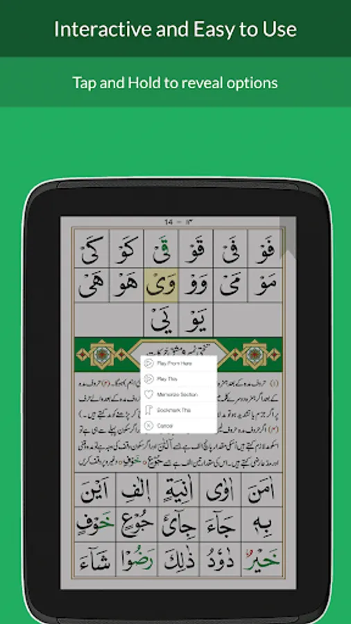 Simply tap and hold on any sentence to play the recitation,repeat and practice, and bookmark.