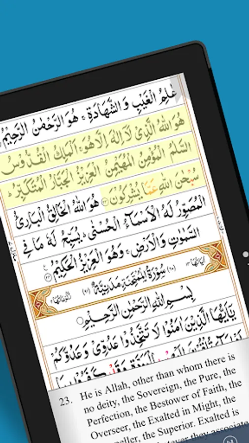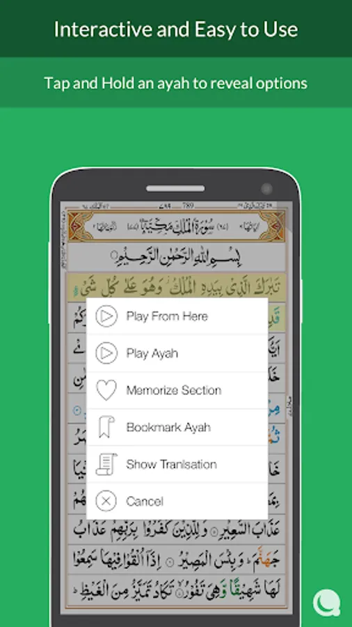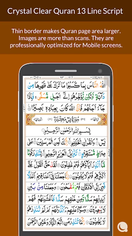 Quran 13 Line is an intuitive Quran app that enables you to read in the classic 13 Line script with interactive audio and translation features. The 13 Line Quran is used by millions of sub-continent muslims across India, Pakistan, South Africa, UK, USA and around the world. Simply tap and hold on any ayah to play the recitation, memorize, bookmark or view the translation.