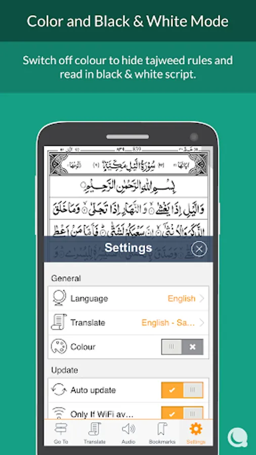 - Classic 13 Line Quran script in book style reading experience, with an easy to use interface