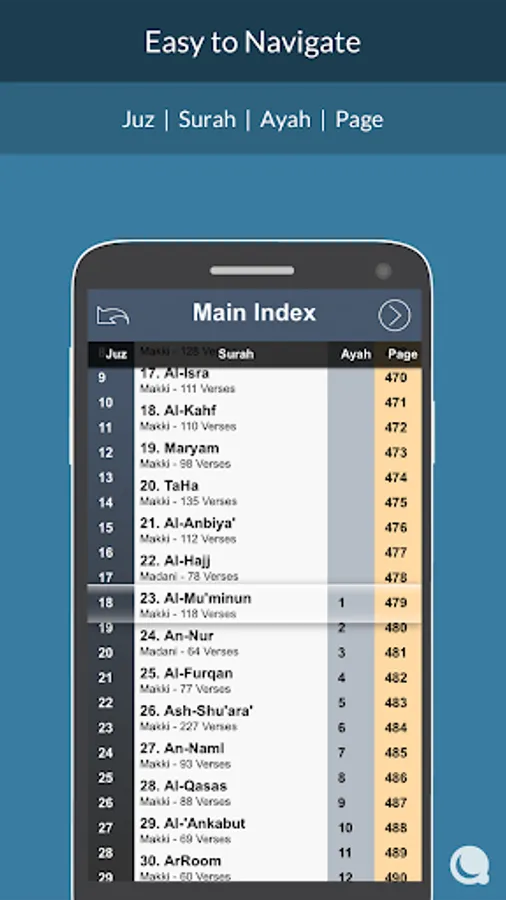 - Main index allow easy navigation to Juz / Surah / Ayah / Page