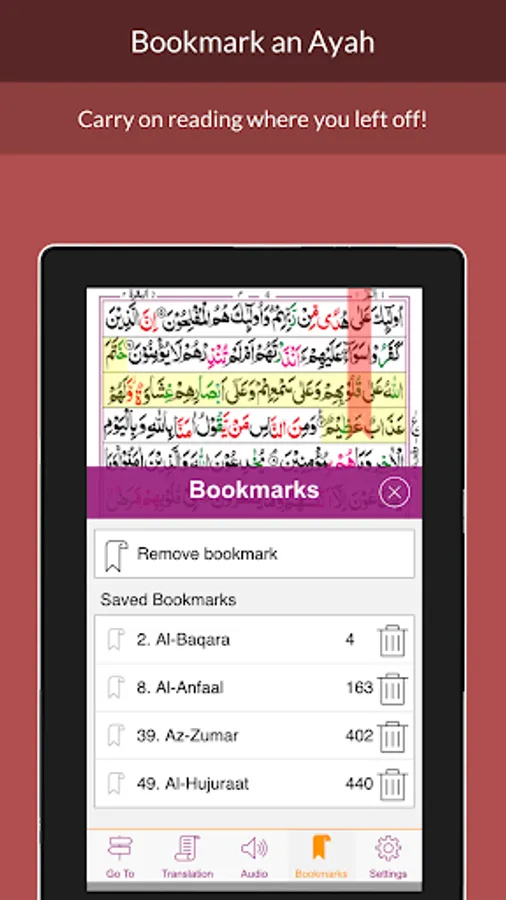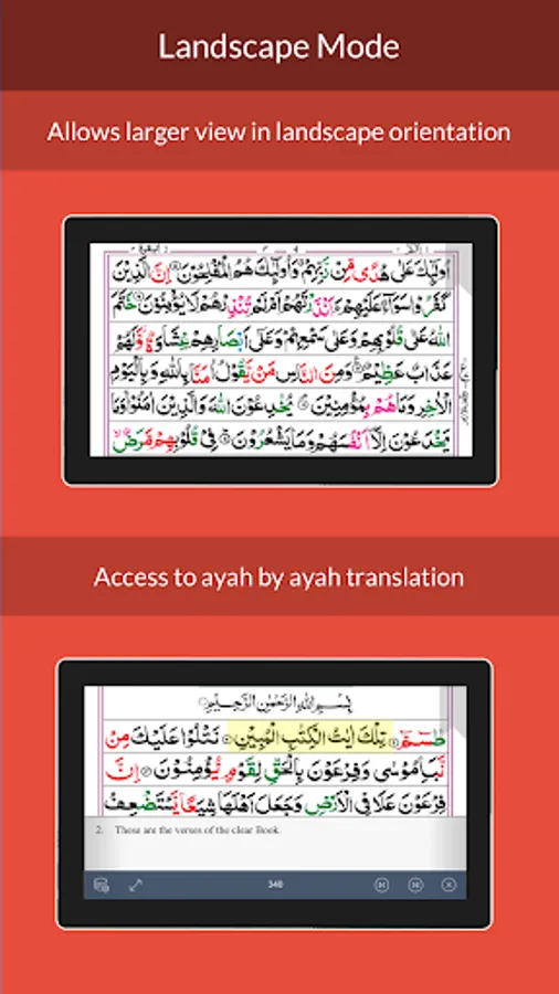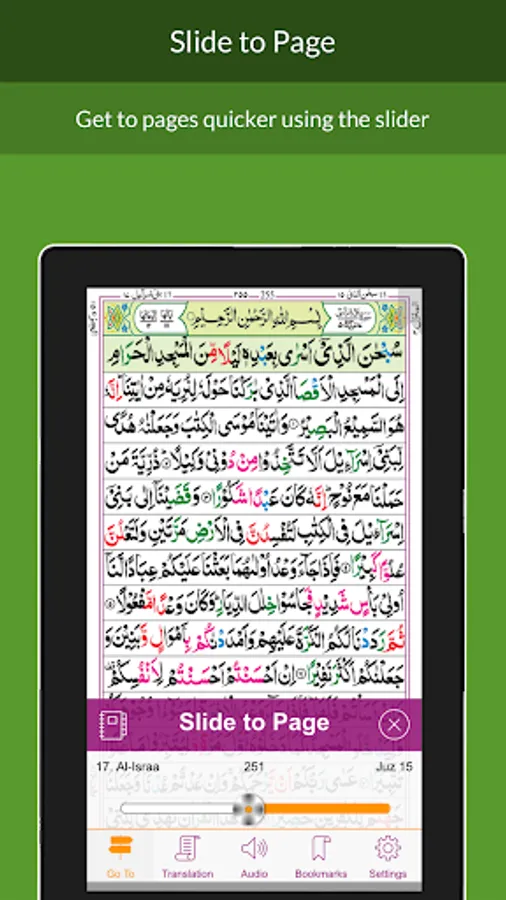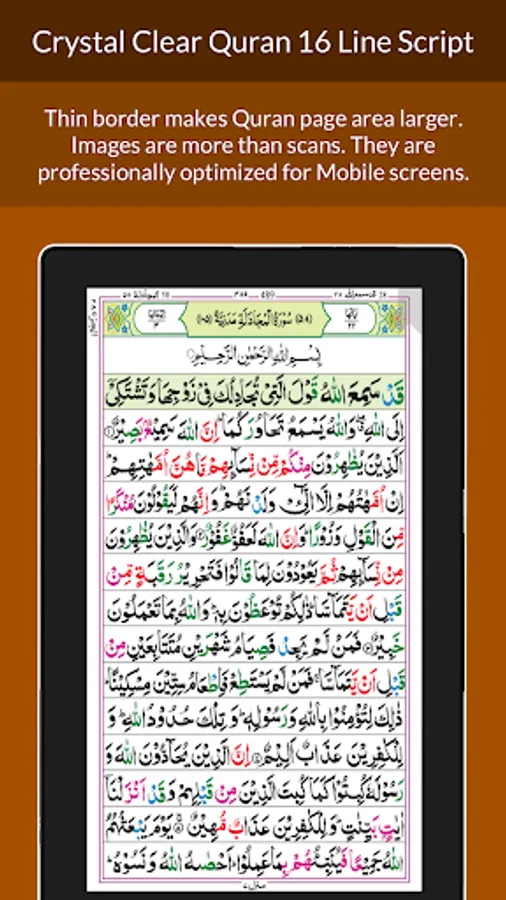 - Classic 16 Line Quran script in book style reading experience, with an easy to use interface