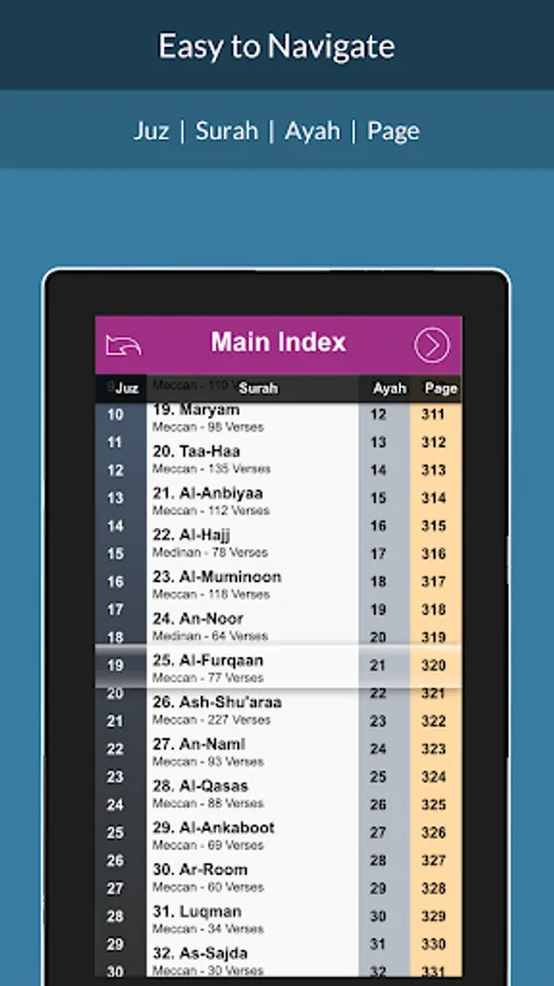 - Main index allow easy navigation to Juz / Surah / Ayah / Page
