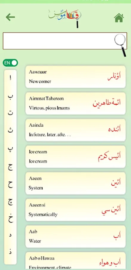 There are 2 sections - Thematic and Qamoos (Listing) dictionary where Mumineen can easily search any word in Lisan-ud-dawat, English and French for the meaning and translation.