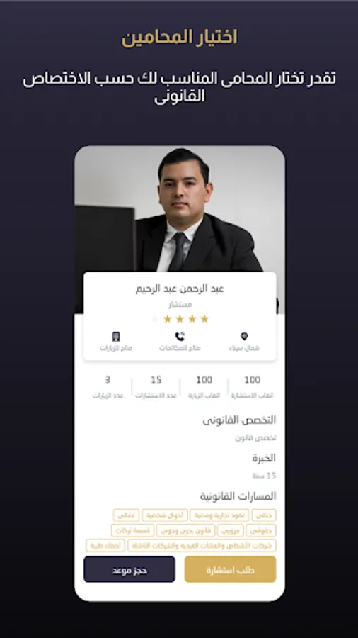 Get now an immediate response to any legal advice with a legal application, an Egyptian legal advice application, based on the forearms of a distinguished elite of lawyers and consultants in various texts of law, download the application and send your advice now.