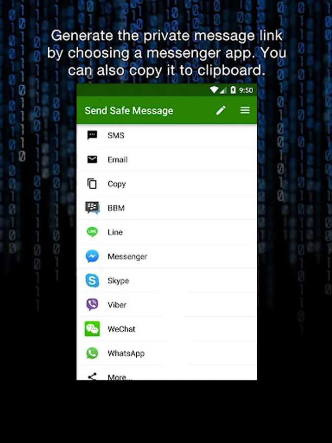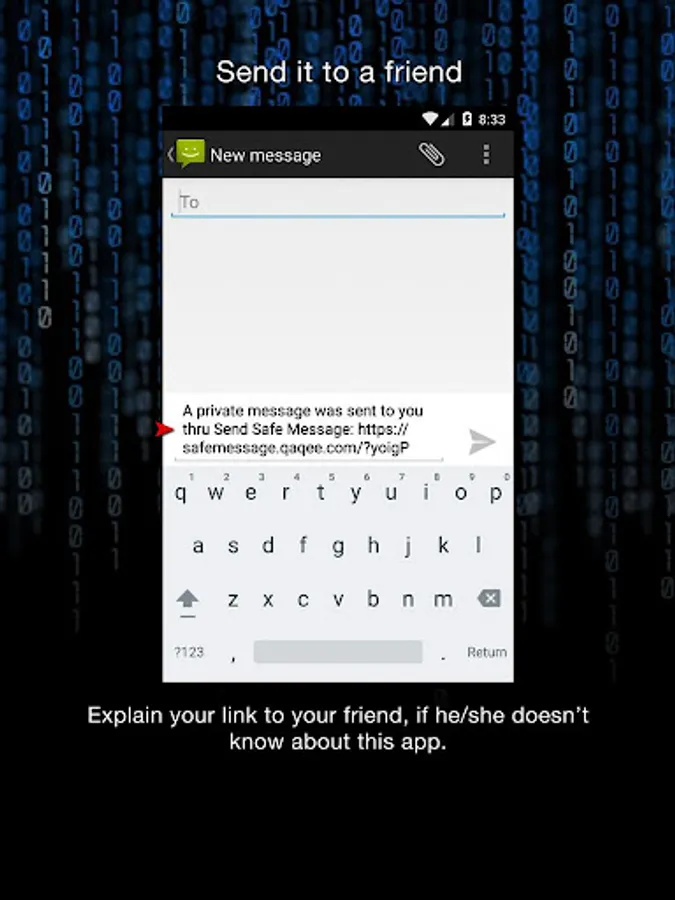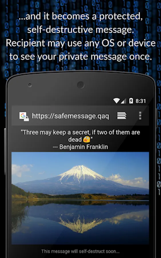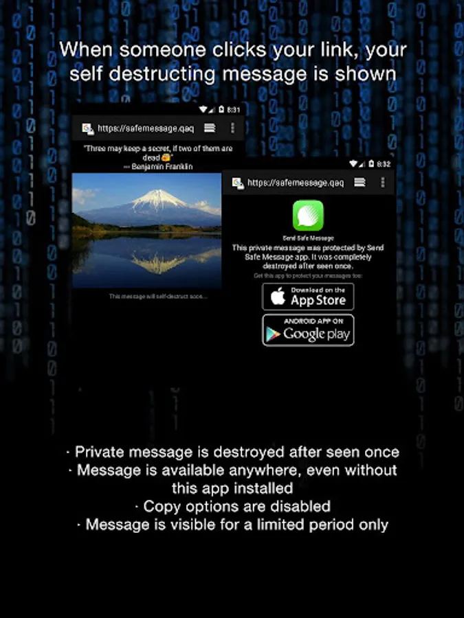 Send safe private messages that self-destruct after seen once. Use with WhatsApp, SMS, Message, Email, Skype, Messenger and others. Message recipient doesn't need to install anything to see your message.