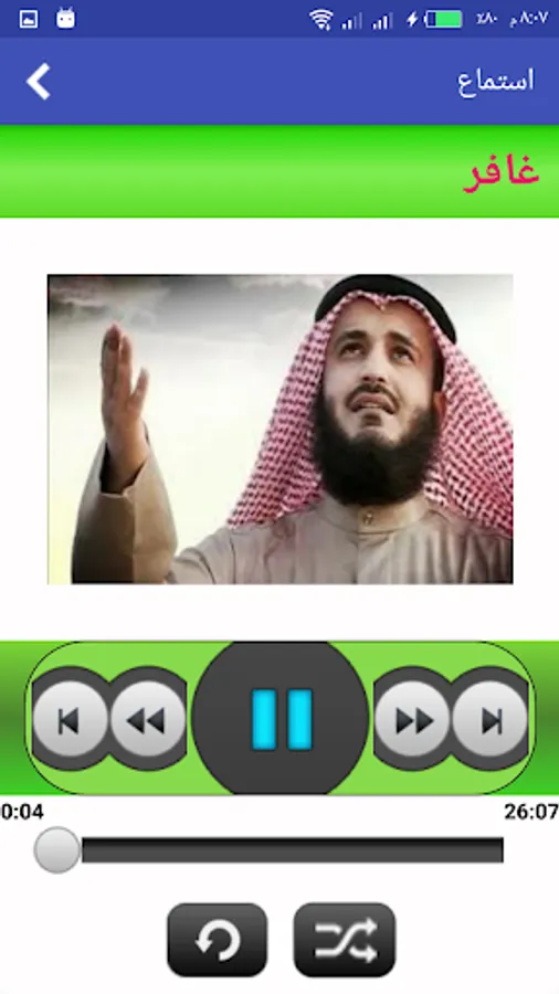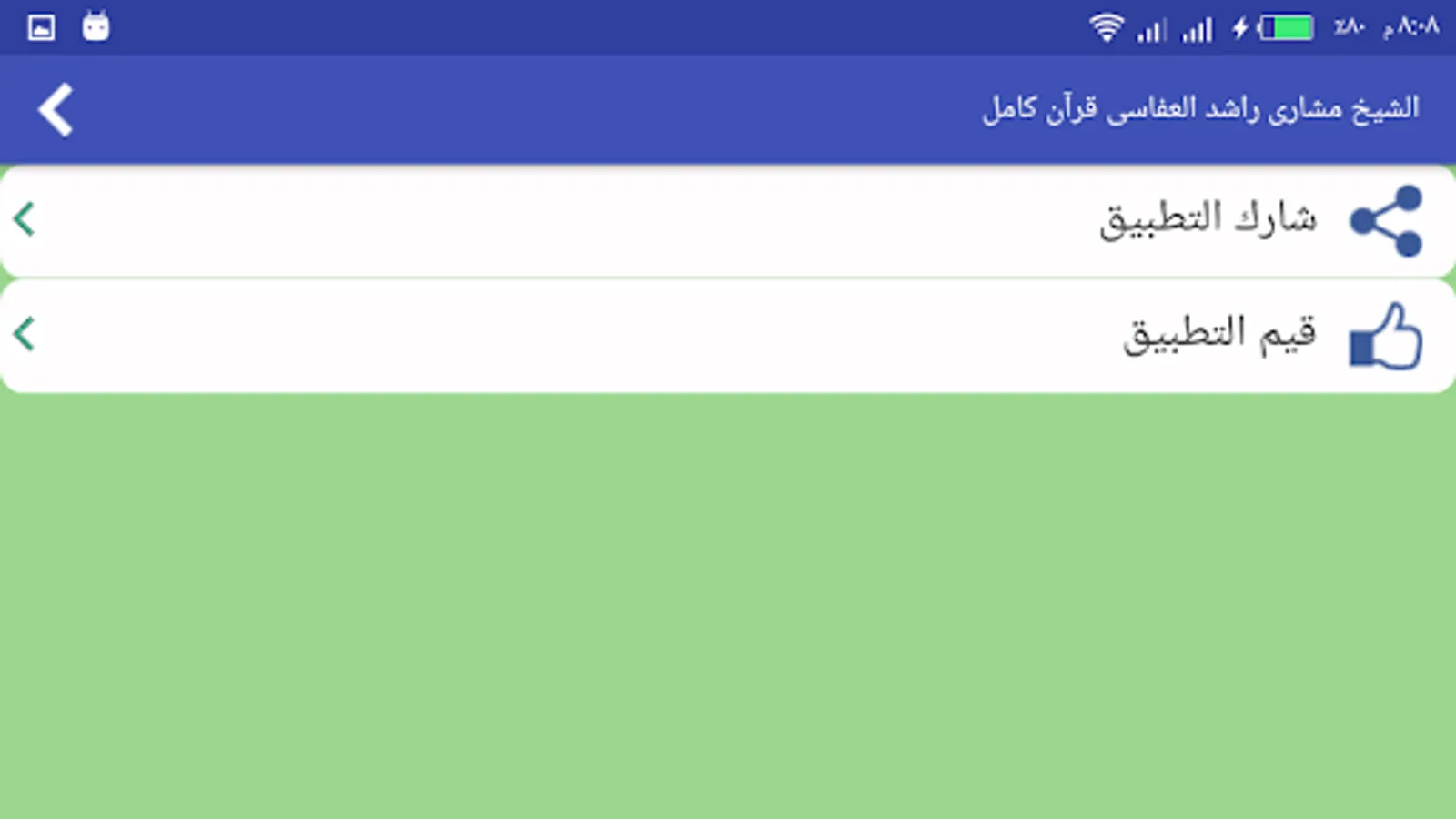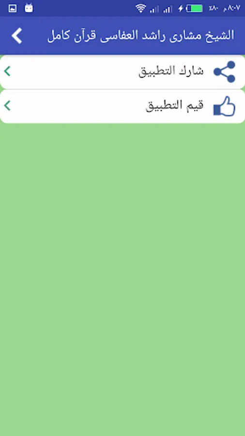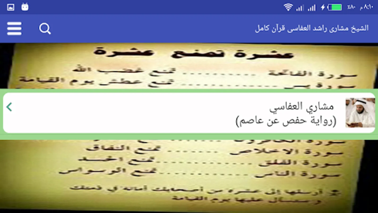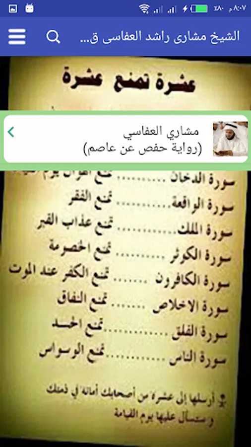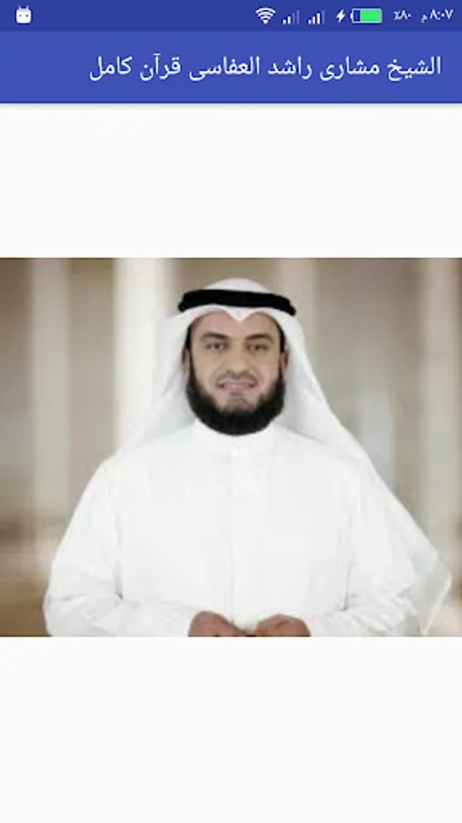 An application for the reader, Sheikh Mishari bin Rashid bin Gharib bin Mohammed bin Rashid Al-Afasy Al-Mutairi, Imam of the Grand Mosque in the State of Kuwait and a preacher in the Ministry of Awqaf and Islamic Affairs in the State of Kuwait, the owner of the first Kuwaiti Islamic channel, Al-Afasy satellite channel. Reader Koran and religious Kuwaiti singer. He has a sweet voice, strength in controlling pitches, wonderful performance, and mastery of recitation, intonation and readings. He has many publications that have spread throughout the Arab and Islamic world and the world.