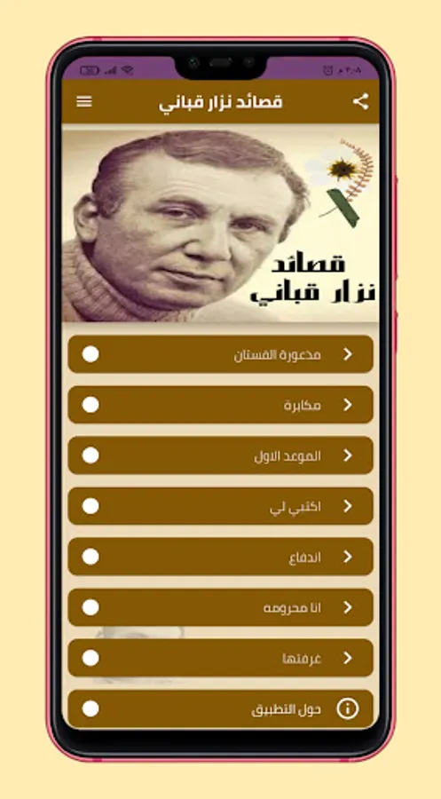 The application of Nizar Qabbani's poems contains the full collection of the poet, which contains Nizar Qabbani's complete poems.