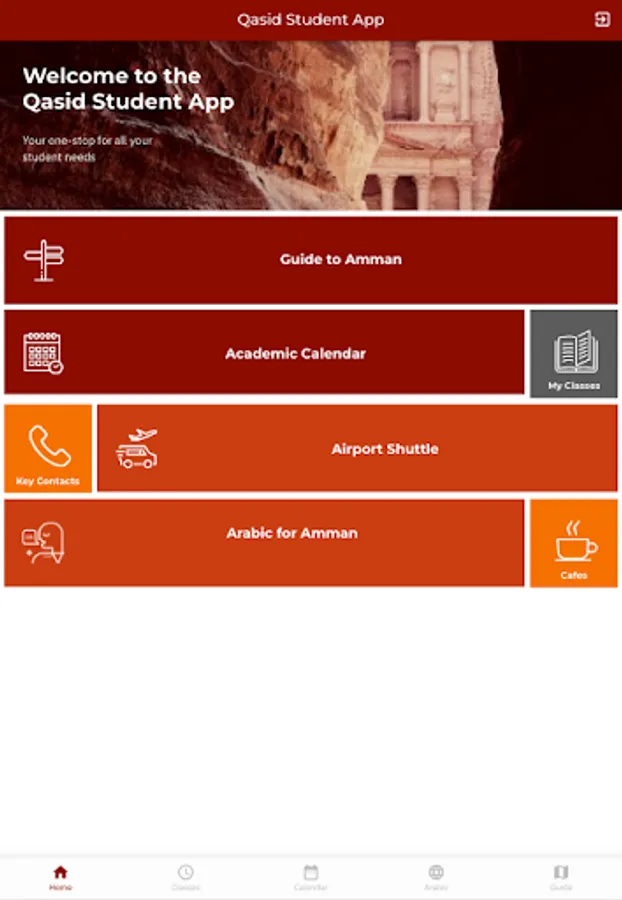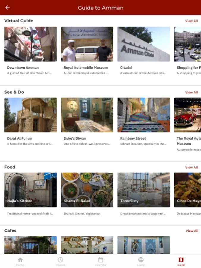 Virtual guide to Amman with video tours, places to visit, list of restaurants and cafes. Arabic for Amman with key Arabic phrases meanings and audio, organized by category to help you navigate around Amman. For students, you also have access to your class schedule, academic calendar, airport shuttle and key contacts