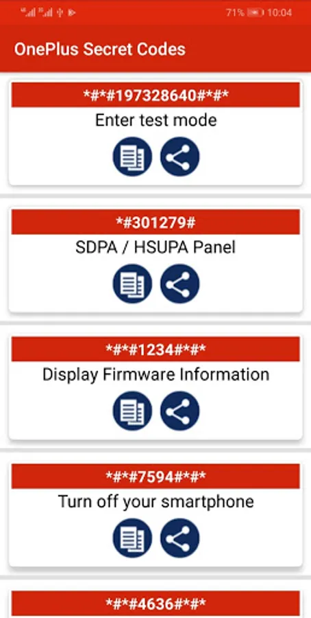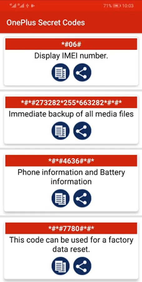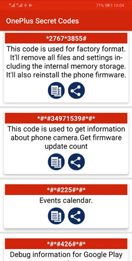 Now You can Discover the secret world of your Android base mobile devices. Some code of them may not work on specific devices, but you can still try them because their manufacturer does not allow them. When those codes are typed manually from the phone dialer or you can copy this code with long press on code and paste it on clipboard. There is also Functionality in the ONEPLUS Secret Codes to share it with Social Apps free and offline.