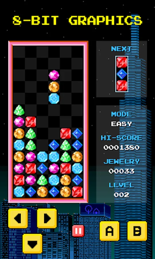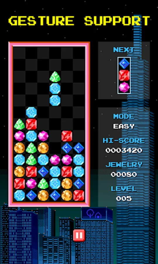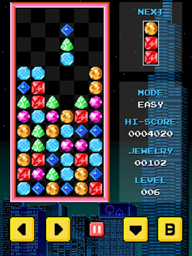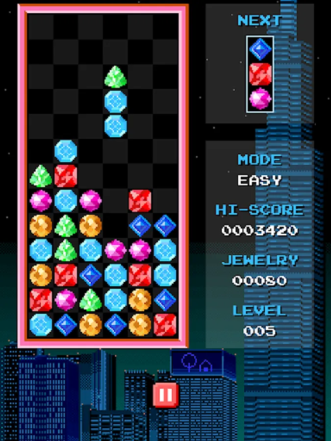 Jewelry Columns is a classic game that has a falling group of 3 jewelries from top of the screen and calls as a column. The column can only be moved left or right when it's falling. The column falls until it reaches landed jewelries or the bottom of the screen. When 3 or more jewelries of the same type line up to each other (horizontally, vertically, or diagonally line), the group of jewelries will be cleared.