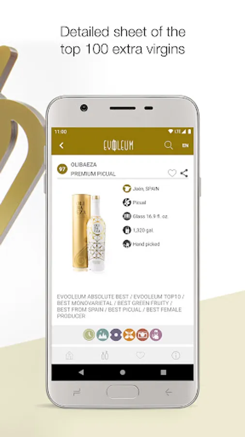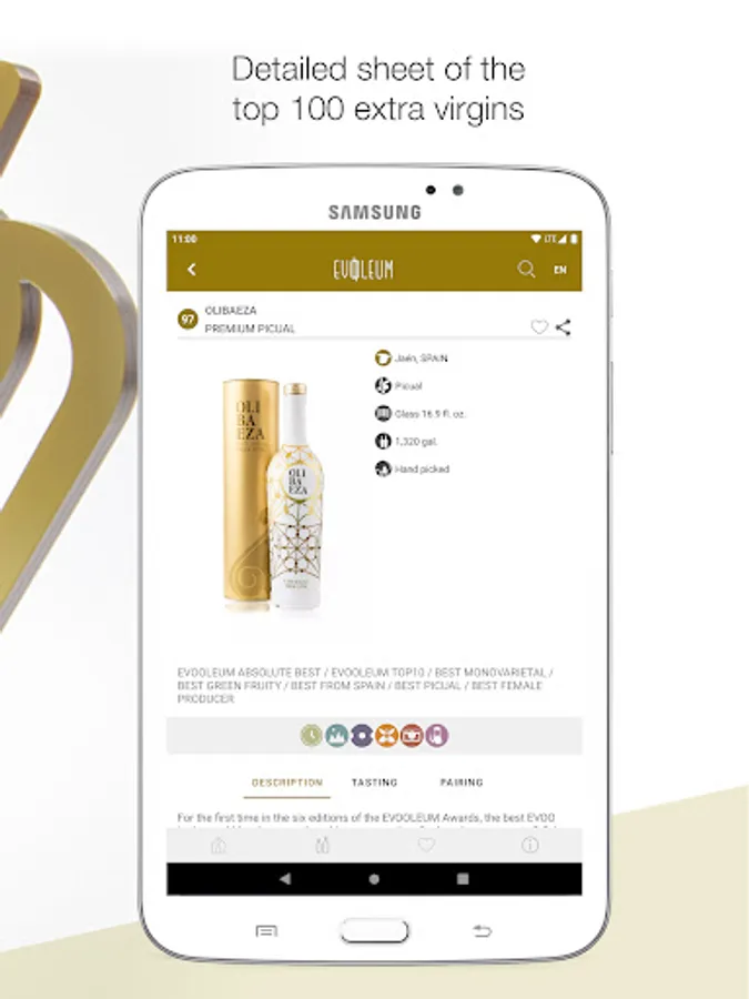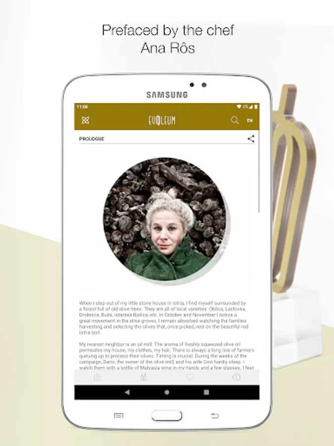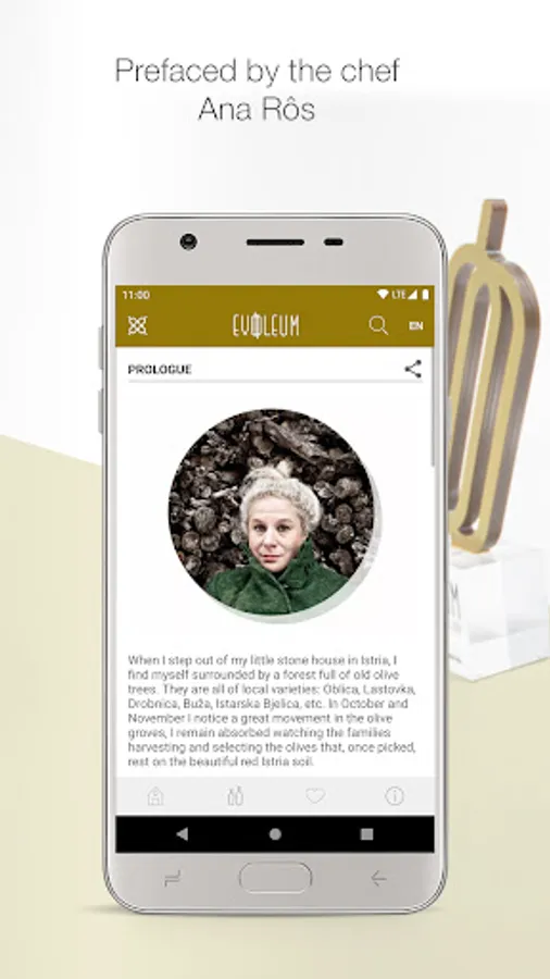 EVOOLEUM showcases the 100 best EVOOs in the world according to the results obtained in the prestigious EVOOLEUM Awards. A deluxe edition prologued by the renowned 2 Michelin-star chef Ana Roš (Hiša Franko) where the user can find Mediterranean recipes by chef Diego Guerrero (DSTAgE), the most surprising oleotourism routes in the world, what celebrities think of extra virgin olive oil, the historical curiosities of the olive tree, pairings... and more much more. A unique app that has become the most influential worldwide.