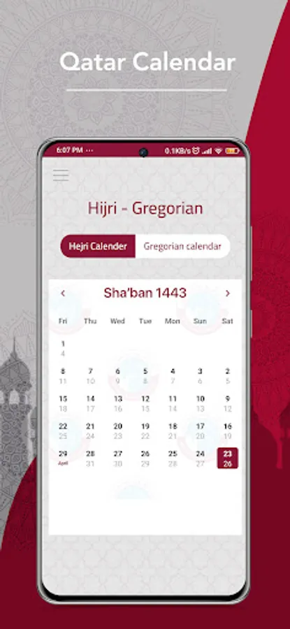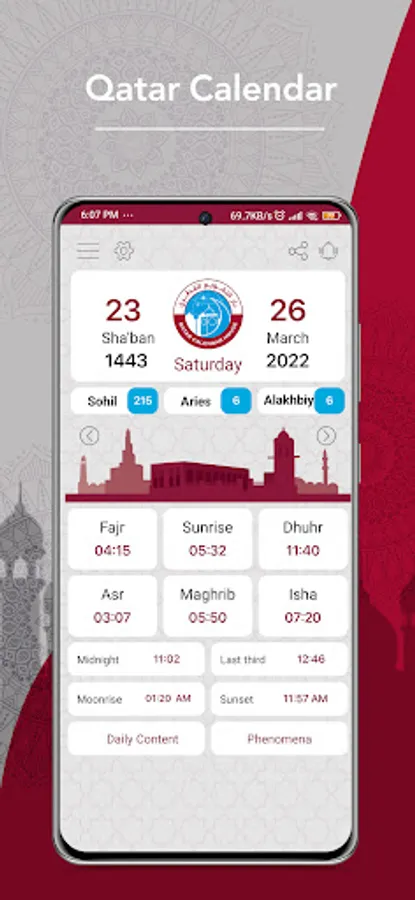 The official calendar approved for the State of Qatar from the account of His Eminence Sheikh Abdullah Al-Ansari Applying the symbol of nut, hunting seasons, weather, hunting seasons and special weather. It also presents a group of astronomical phenomena, Muslim remembrances, midnight dates and the last third of it, and many other features
