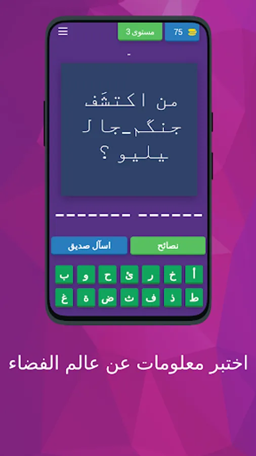 The key words for searching for the game are: competition, entertainment, guessing, entertainment competitions, knowledge games, space, science, discovery.