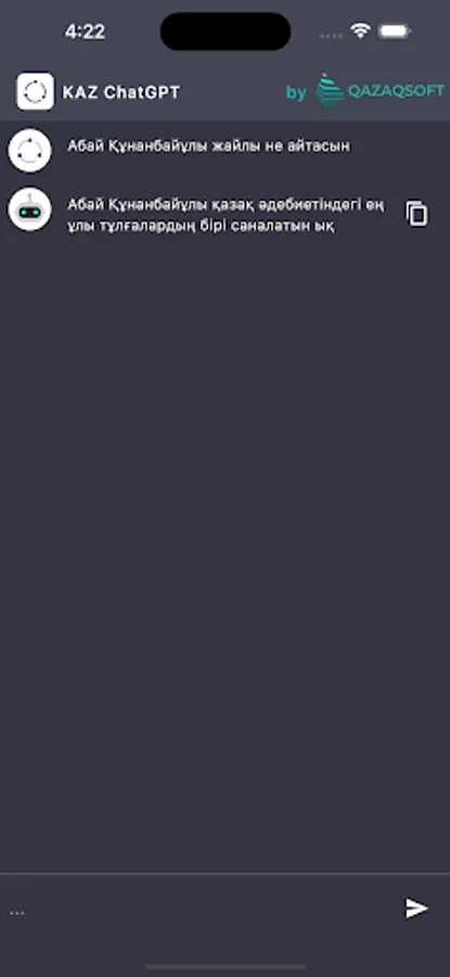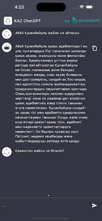 Introducing our advanced artificial intelligence assistant built using the OpenAI GPT API. It is used for creating text in Kazakh language, writing essays, e-mails, poetry, song lyrics, etc. Say goodbye to long searches and welcome KazChatGPT's prompt assistant.