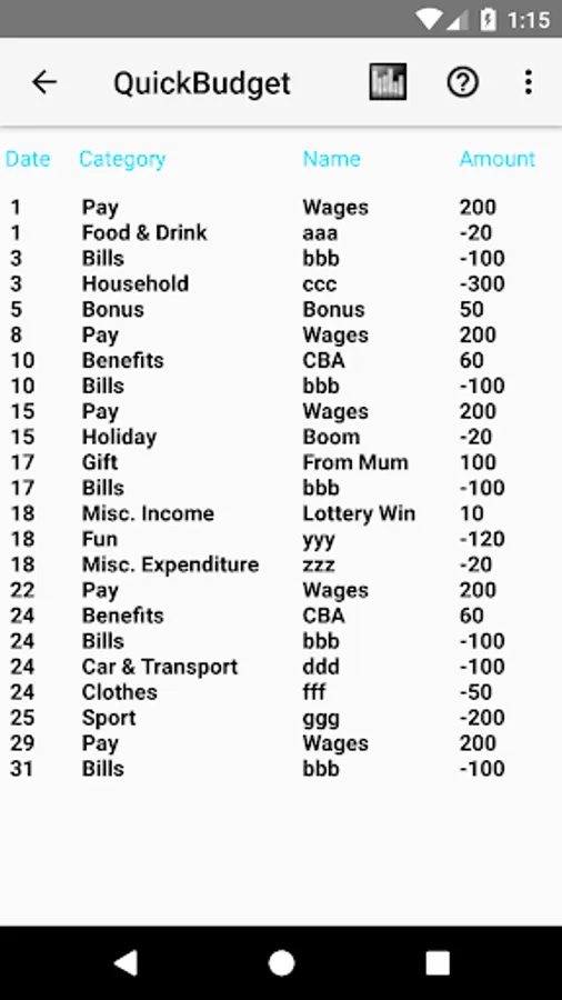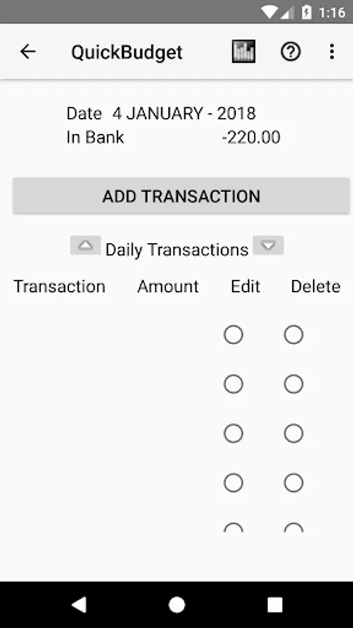 Fast - Quick and easy. Simply click on the date of the transaction you would like to add, select the add transaction from the next screen and enter the transaction. Select either One Off, Weekly, Fortnightly, Four Weekly, Monthly. Three Monthly, Six Monthly or Yearly and Quick Budget will work it all out for you.