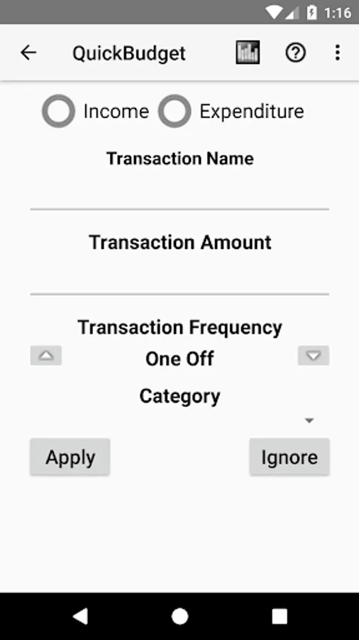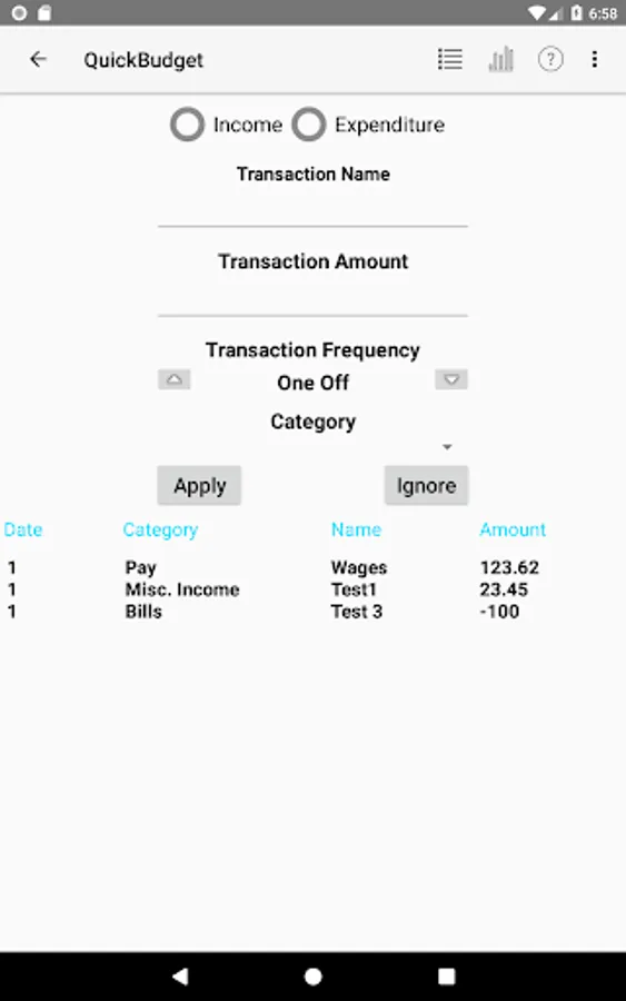 Fully functioning budget app that is NOT restricted until you upgrade to a paid account or a need to sign in to an account for full use. Simply start using straight away. More features will be added at a steady pace making sure that the app is simple, fast and effective.