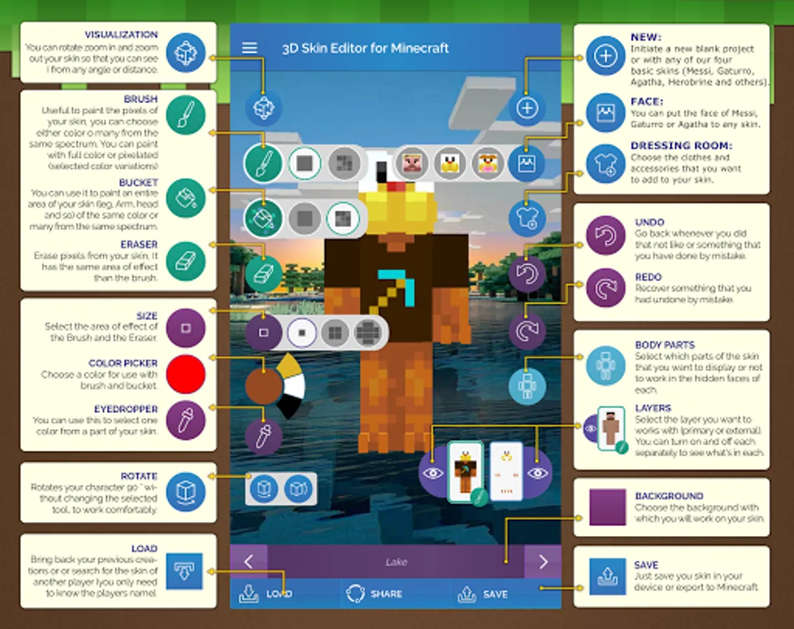 Use advanced tools like brush, paint bucket, eraser and color picker to edit your skin and create just the look you've been searching for!