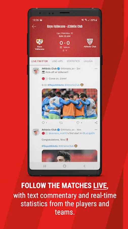 ⭕️ LIVE MATCHES. Get live text commentary from the first teams' LaLiga and Copa fixtures with real-time player and opponent statistics. Activate push notifications to receive alerts for kick-off, half-time, full-time and match goals.