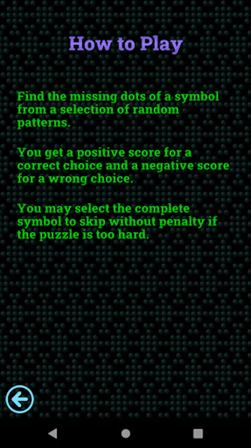 Find the missing dot patterns for a symbol, from a set of random patterns. Sounds simple, but it's harder than you think. As you progress more symbols are introduced and more dots are missing.
