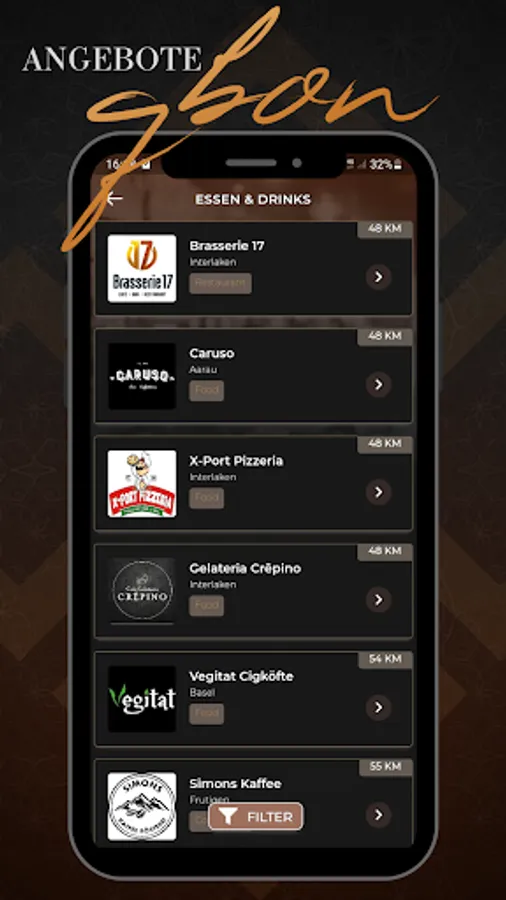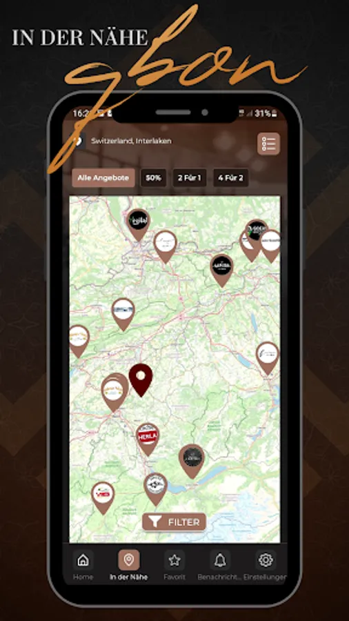 » Lust auf ein Schnäppchen? Dank der praktischen «In der Nähe» Funktion, siehst du sofort wo die nächstgelegenen 2 für 1 Angebote sind.