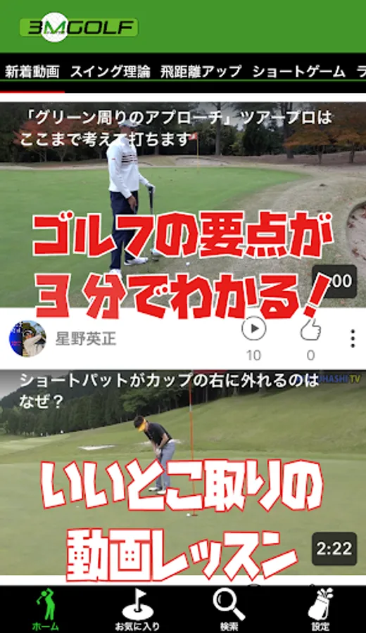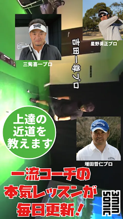 What makes 3 Minute Golf special is the gorgeous line-up of official instructors. Videos taken by Kiichi Misaki, Hidemasa Hoshino, and other charismatics who are overwhelmingly popular on certain video sites, and videos of their best points will be uploaded every day!