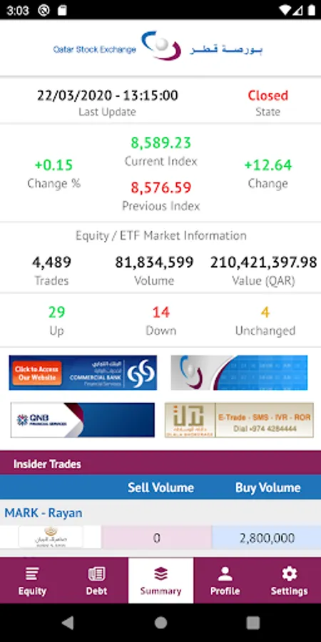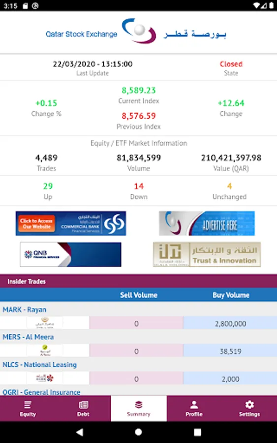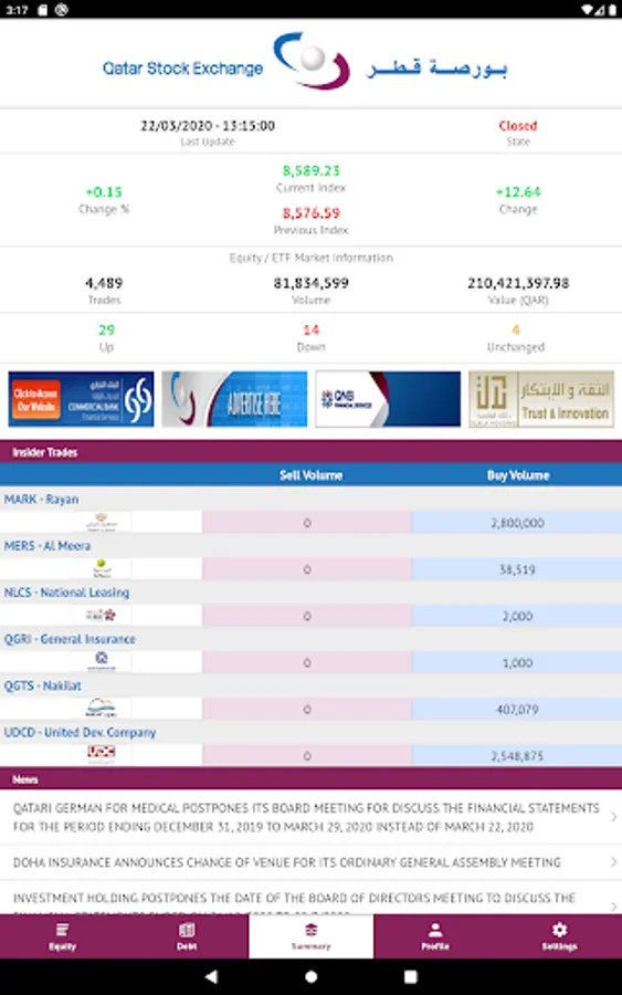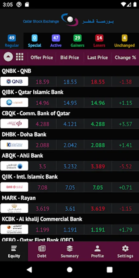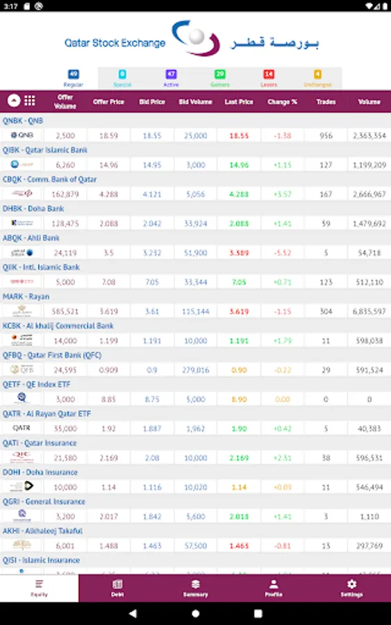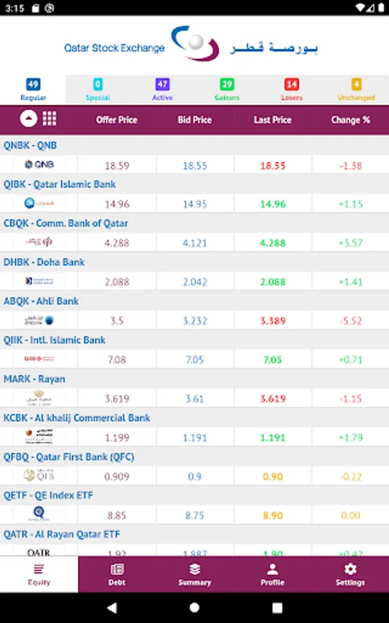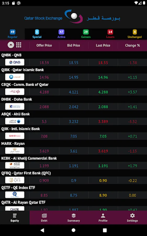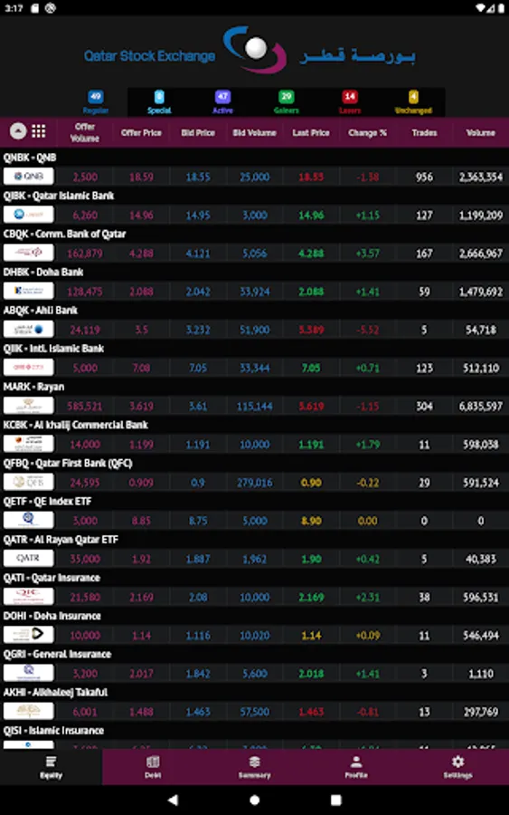 The application offers innovative features designed to help users in their investment decisions. These features include: market statistics in real time, securities trades in real time, historical price graphs, Qatar Stock Exchange and companies news and profile. In addition to this, users can configure a list of their preferred stocks for direct access to associated data.